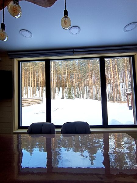 - светлая, просторная комната — студия с большим панорамным окном, с прекрасным видом на сосновый лес;