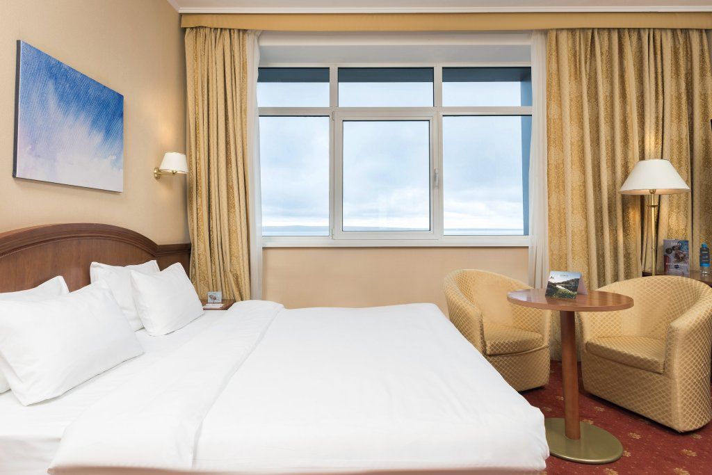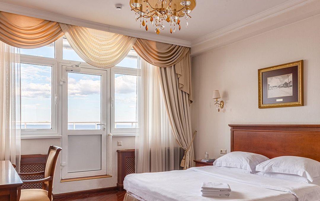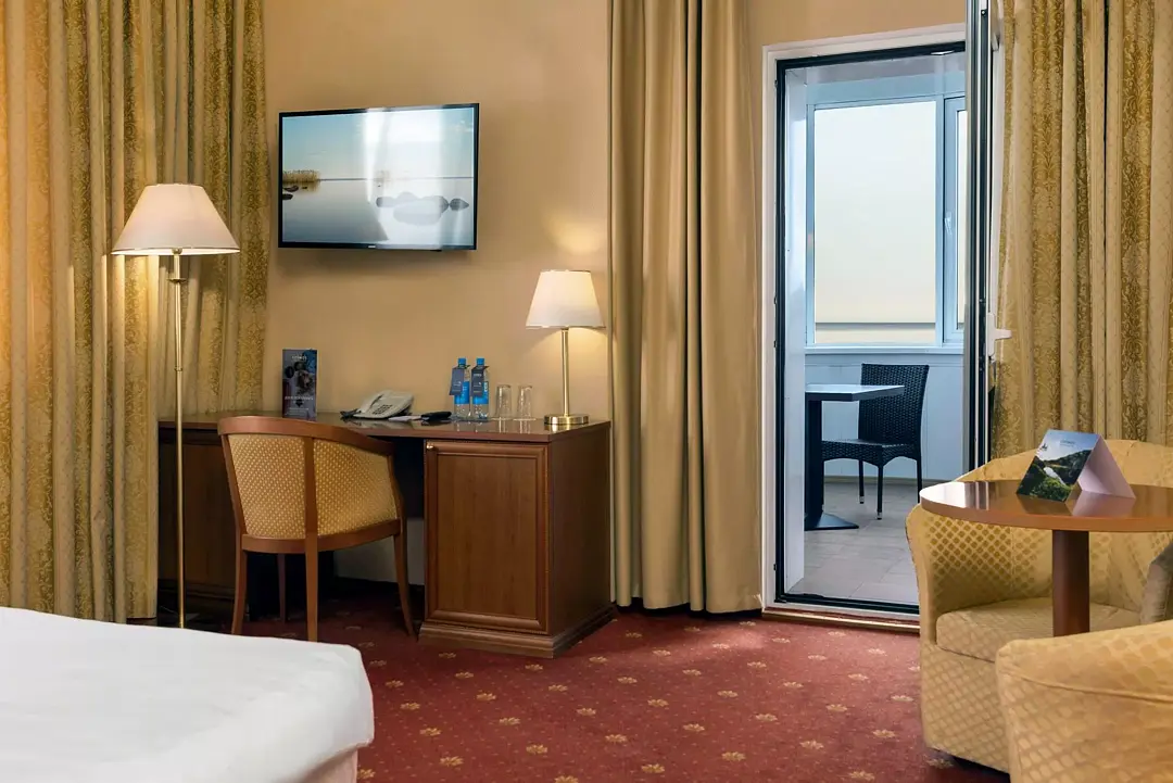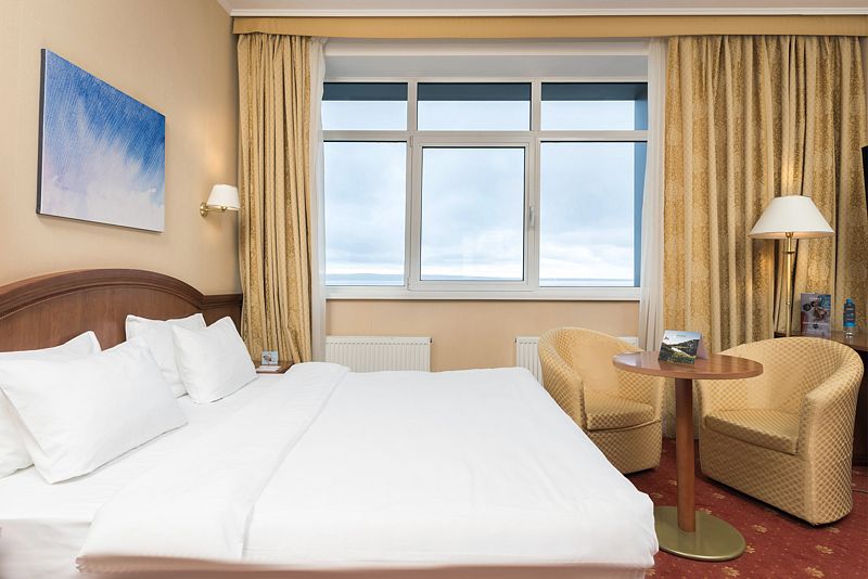 Просторный номер со светлой спальней и лоджией. Двуспальная кровать с ортопедическим матрасом и меню подушек, телевизор, сейф для ценных вещей, а также 2 больших кресла для отдыха.