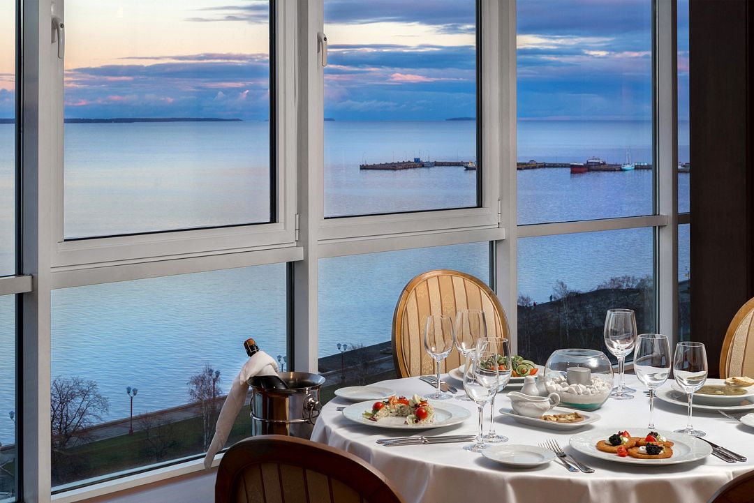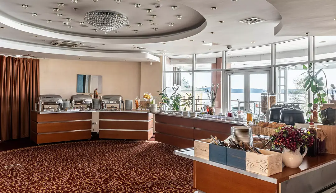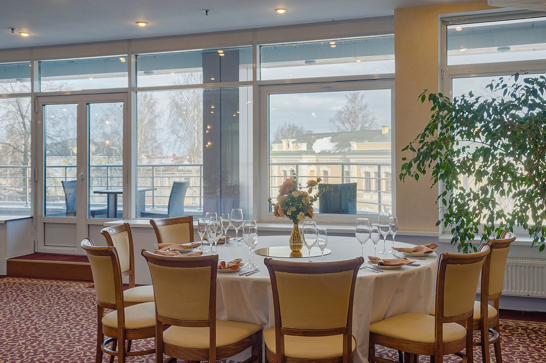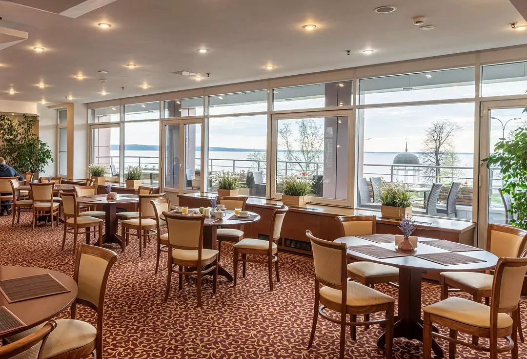 Просторный зал Бульвар с естественным светом и живописным видом на Онежское озеро расположен на 2-ом этаже отеля. Идеально подходит для проведения семейных торжеств, свадеб или корпоративных фуршетов. В тёплое время года открыт выход на балкон.