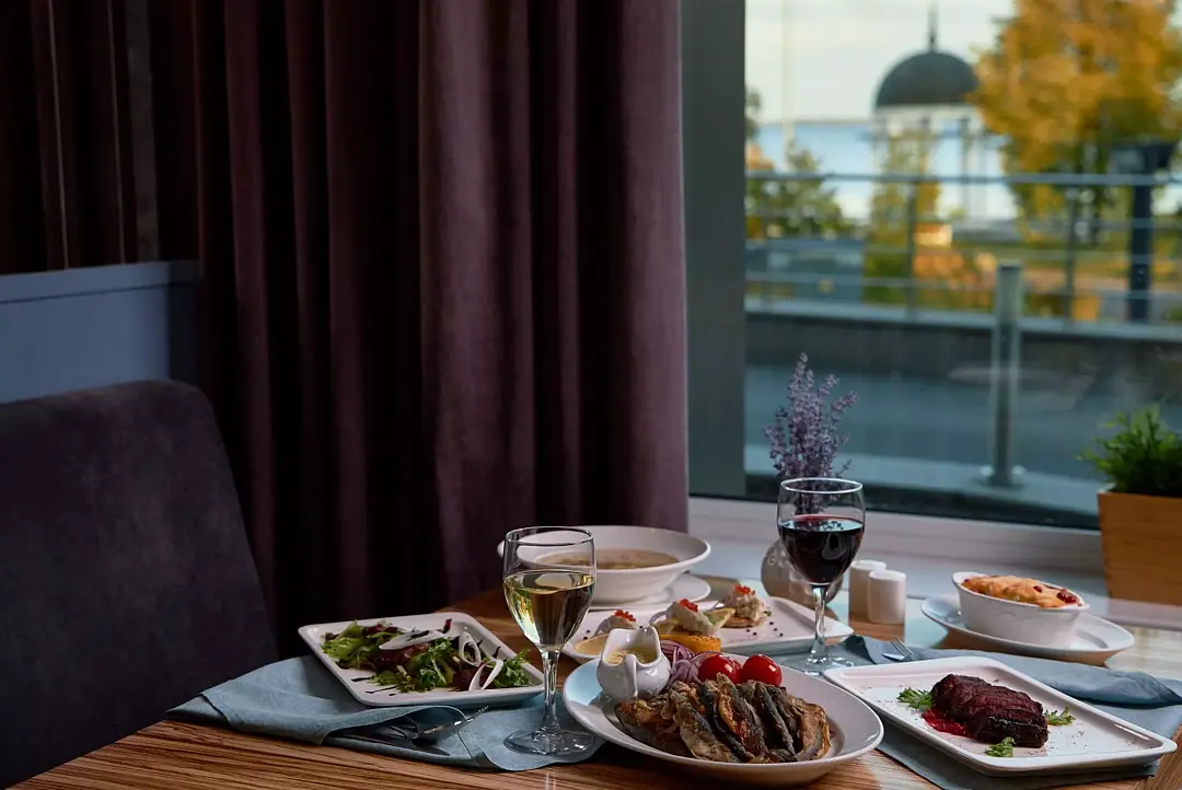 В ресторане Cosmos на 1 этаже отеля можно отведать блюда авторской кухни Карелии. Завтраки в формате «шведский стол» сервируются на 2 этаже отеля в ресторане Бульвар с видом на озеро.