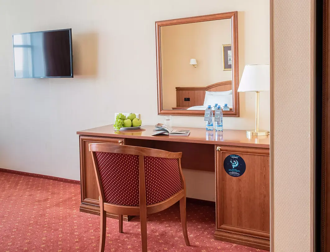 Стандартный номер, где есть всё необходимое и даже больше. Двуспальная кровать с ортопедическим матрасом и меню подушек, телевизор, сейф для ценных вещей.