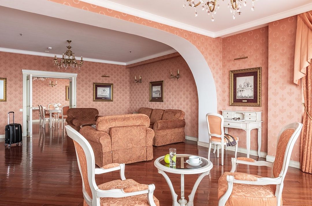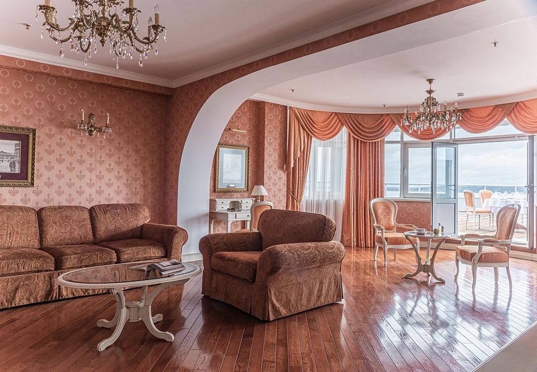 Элегантный пятикомнатный номер. В вашем распоряжении: 2 спальни, гостиная с камином и уютной зоной отдыха, обеденный зал, кухня, лоджия и открытая терраса с видом на Онежское озеро.