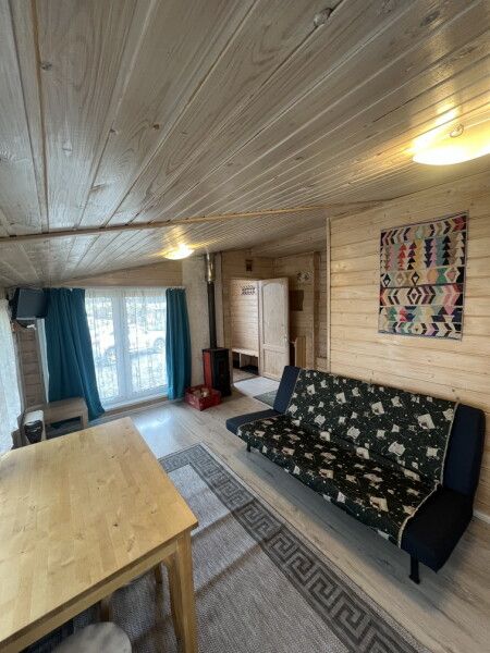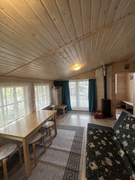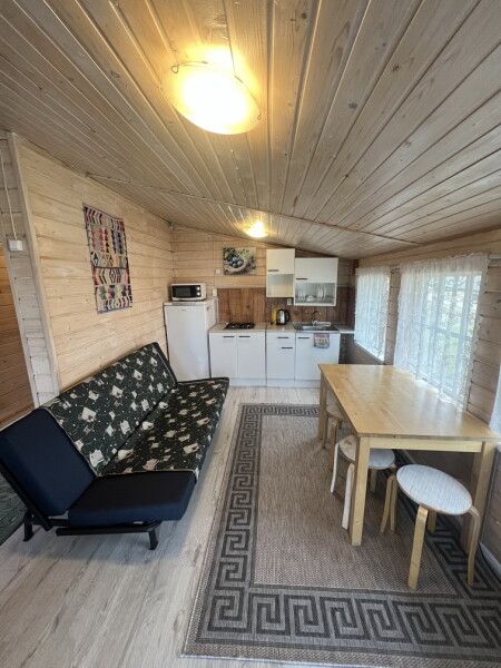 Дом для отпуска располагает гостиным уголком с телевизором и мини-кухней с холодильником, варочной панелью и электрическим чайником, двухъярусная кровать, диван, односпальные кровати. Стол может быть накрыт на меблированной террасе. Из окон можно любоваться видом на реку.