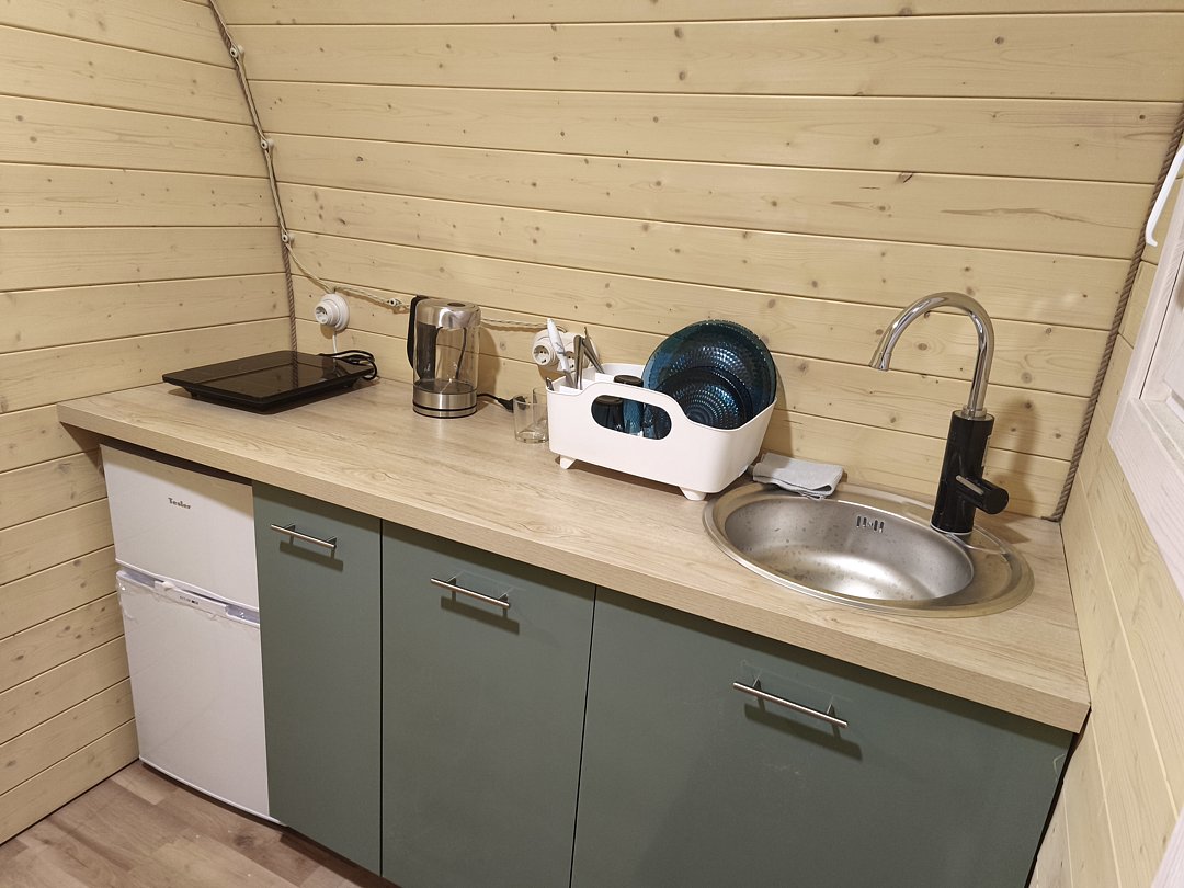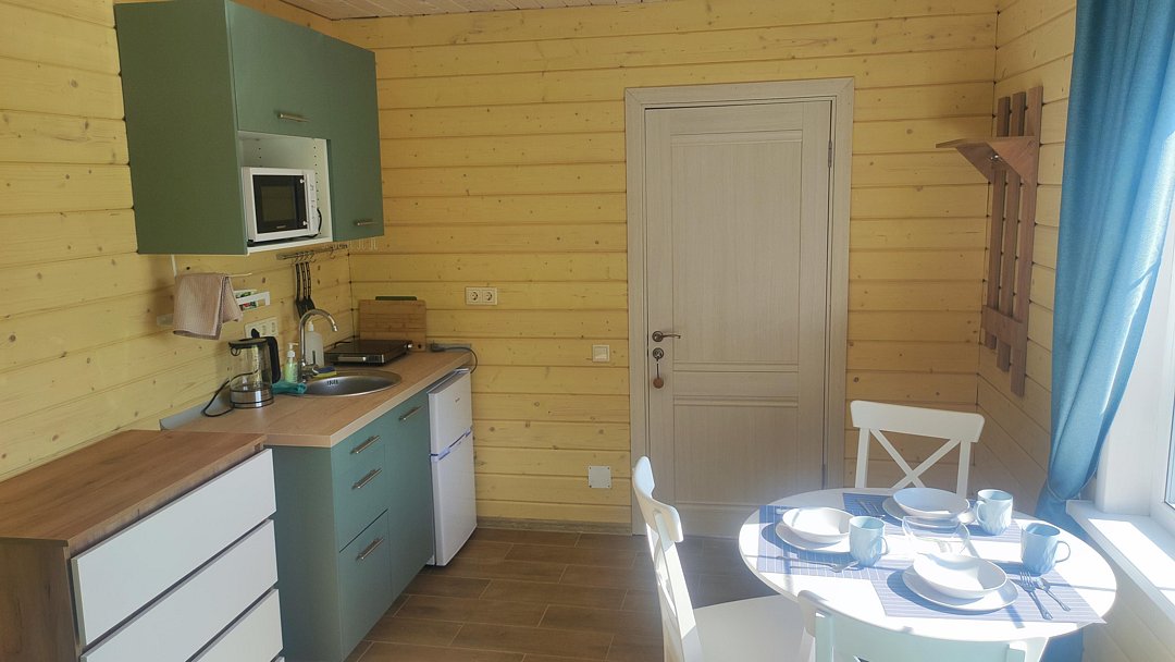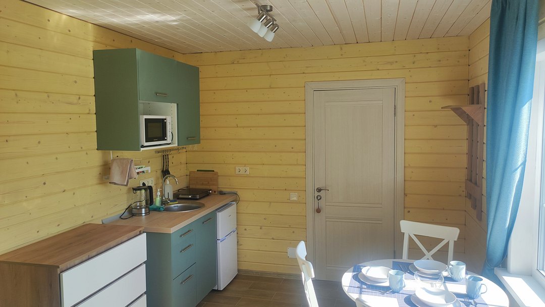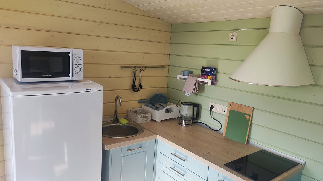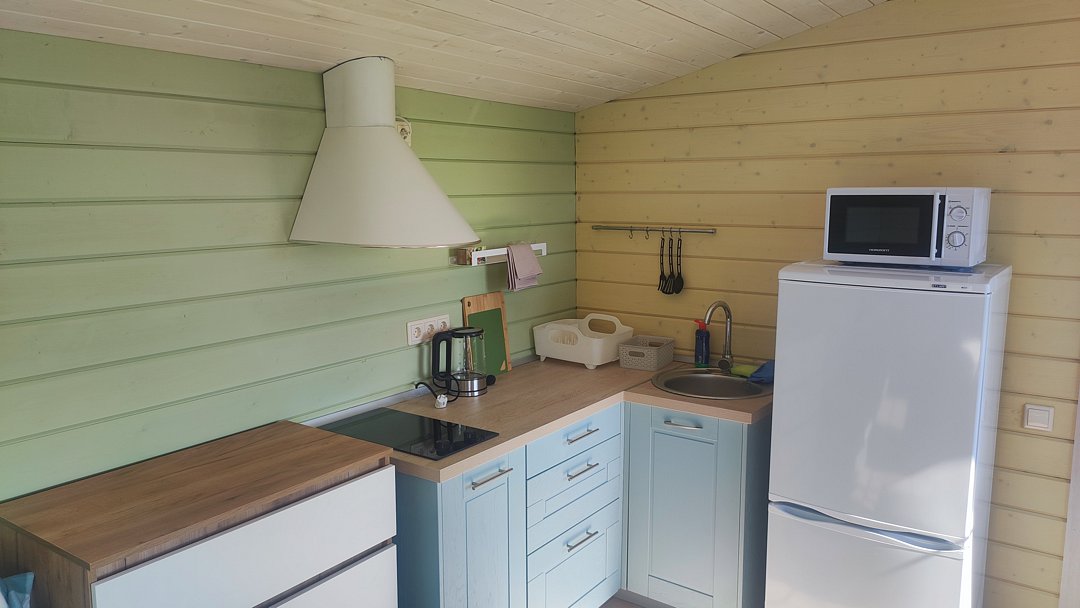 Кухня оборудована холодильником, раковиной (с питьевой водой), чайником, плитой и всей необходимой кухонной утварью.
