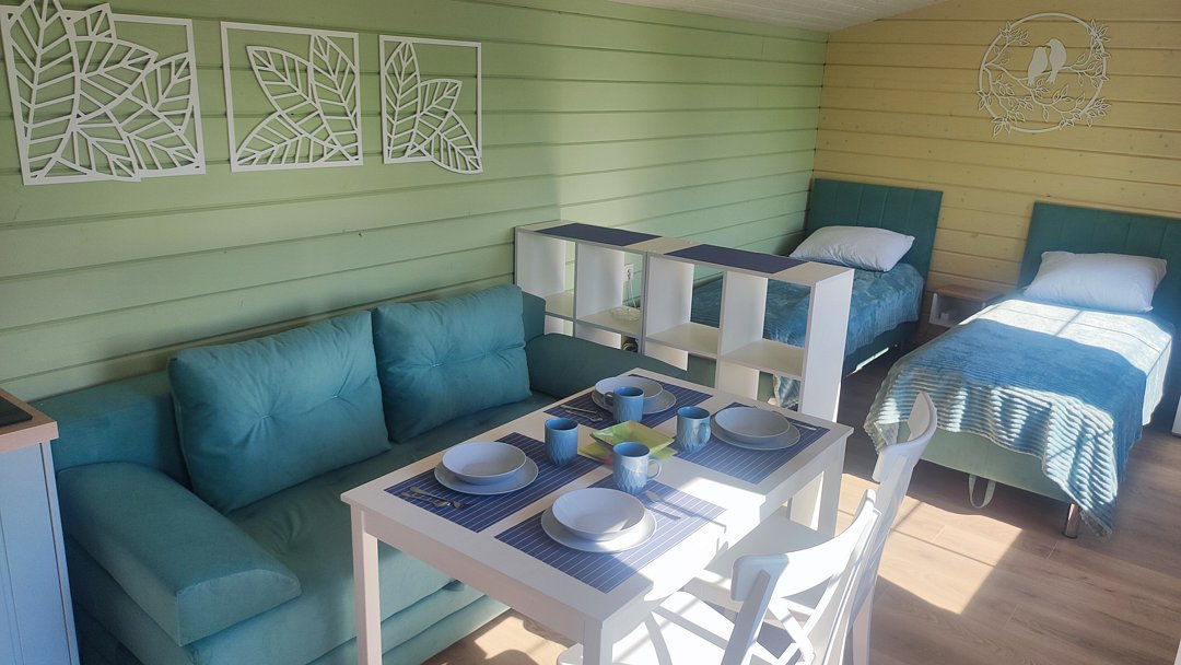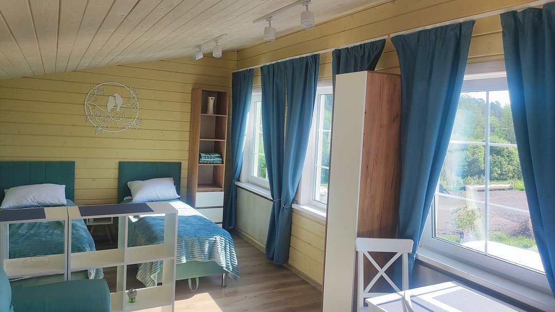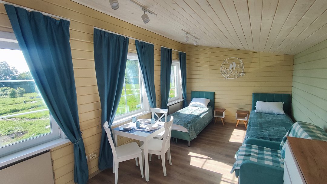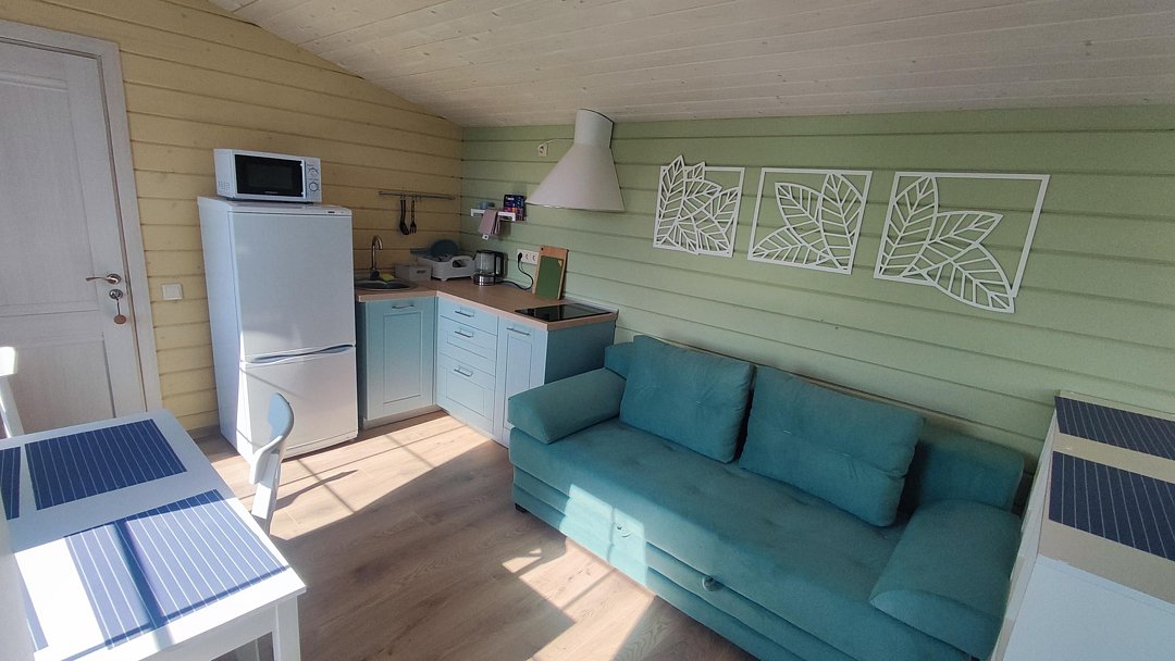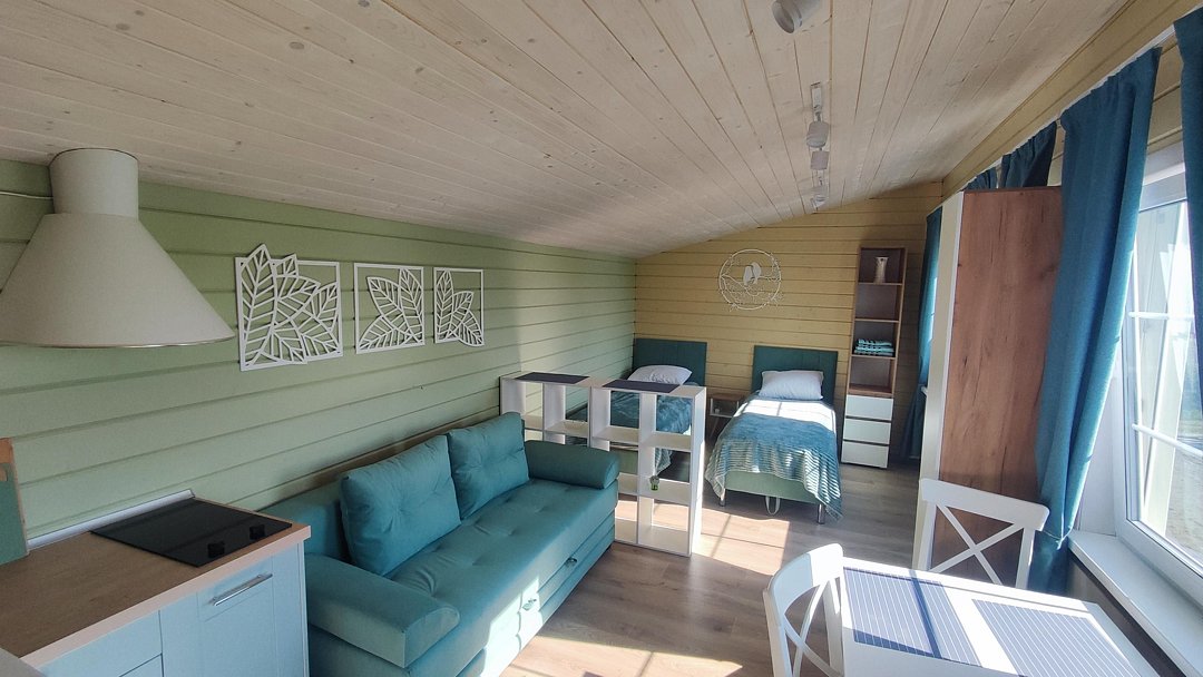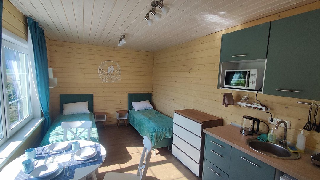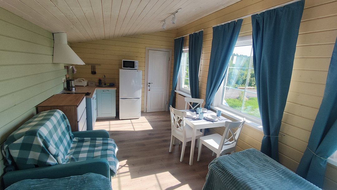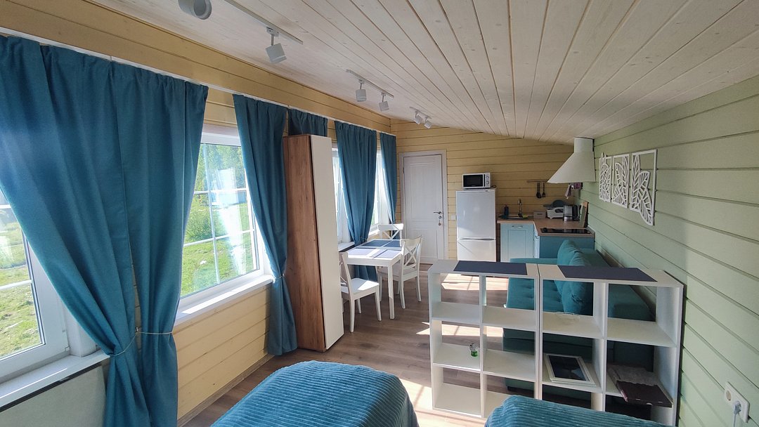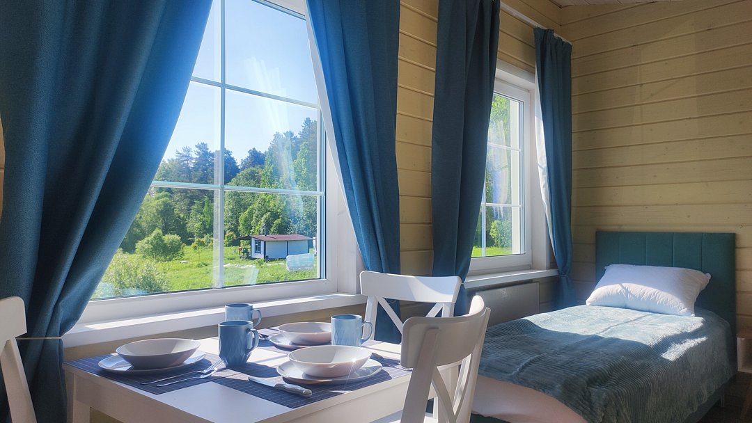 Гостей ждут уютные апартаменты с видом на Ладогу, а также небольшие домики для двоих, все из которых оснащены собственными кухнями. Для любителей более близкого общения с природой обустроен кемпинг с удобствами на территории.