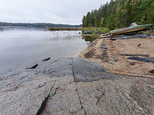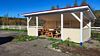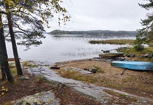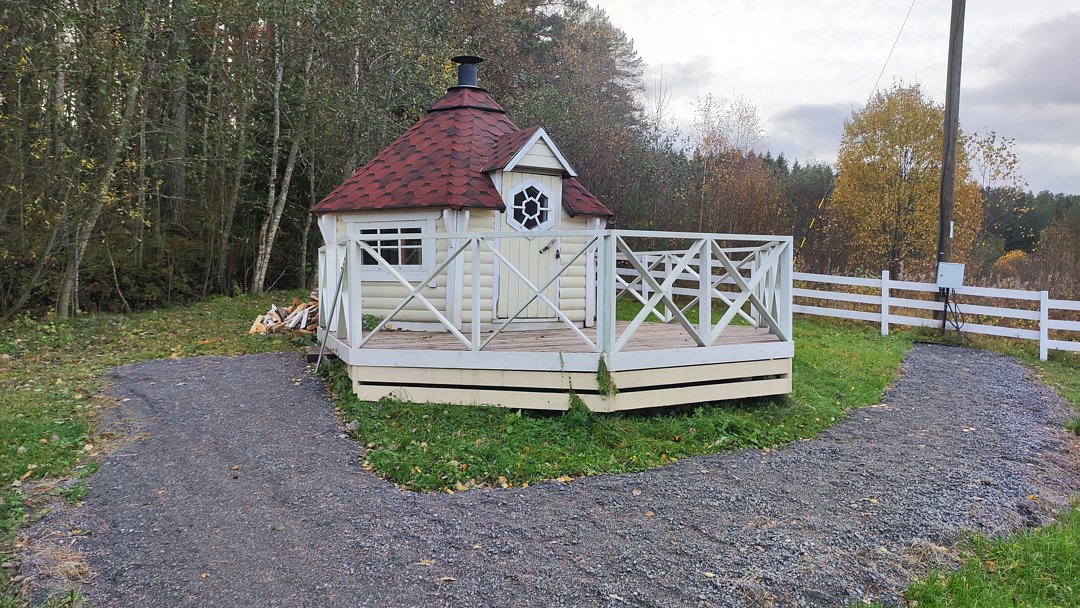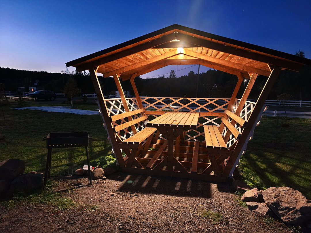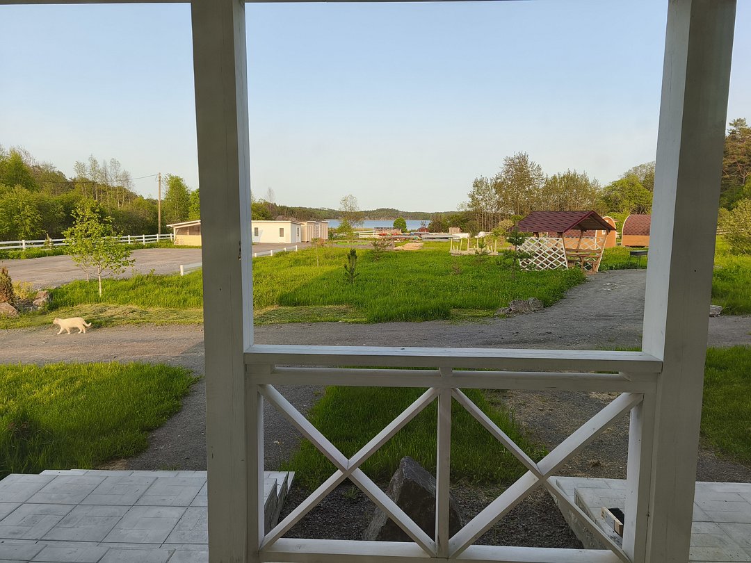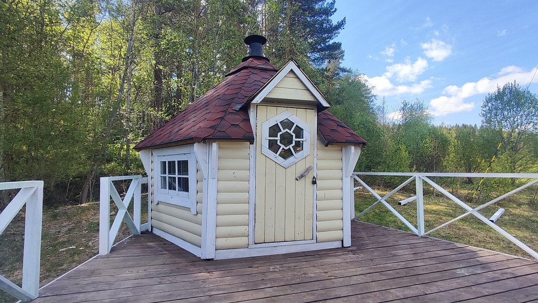К услугам гостей возможность удобно разместиться для приготовления шашлыка или плова в гриль-домике с открытой террасой. На террасе дополнительно установлен стол и две лавки, чтобы можно было посидеть в хорошую погоду на открытом воздухе. Гриль-домик установлен в верхней точке участка, поэтому с террасы открывается красивый вид на территорию и ладожские шхеры.