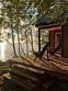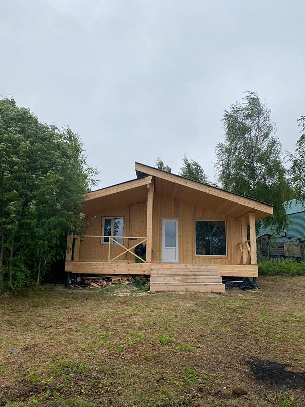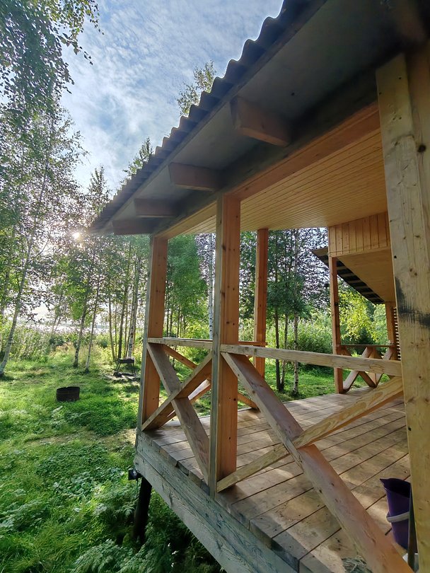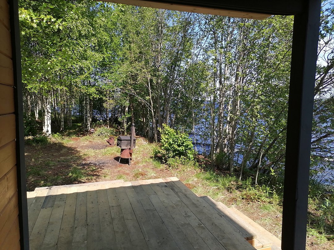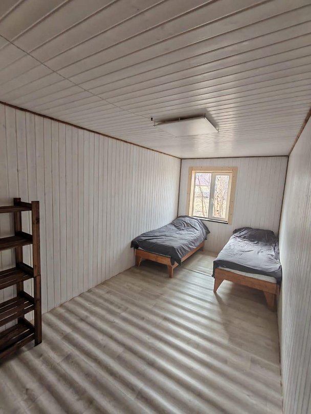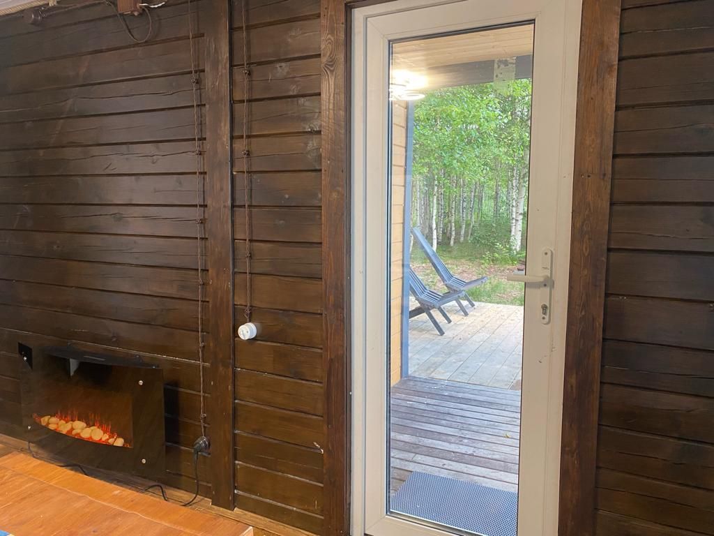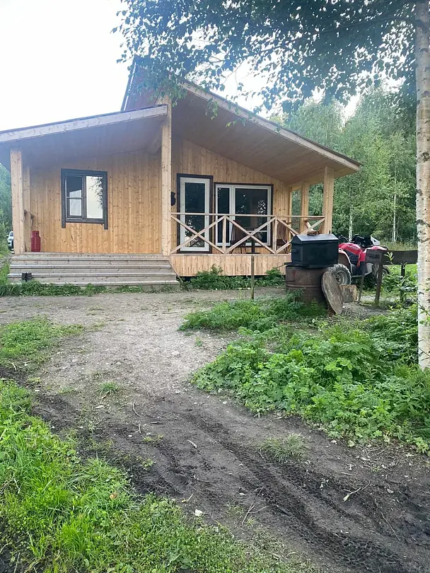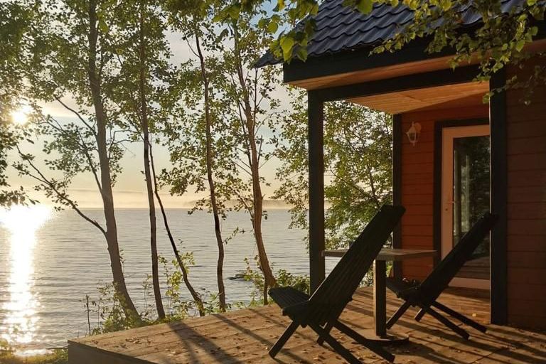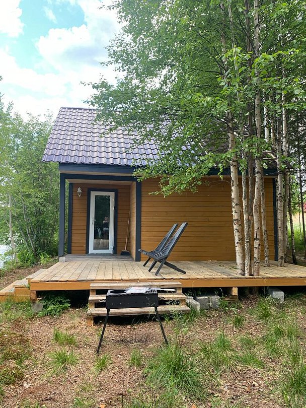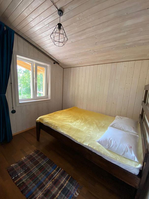 Полноценный одноэтажный комфортабельный дом, расположенный в 15 метрах от воды. С двумя спальнями. В одной двух-местная кровать с видом на озеро. В другой спальне двухьярусная кровать и односпальная вид на улицу. На первом этаже кухня-гостиная с панорамным окном, камином, столом со стульями и раскладным диваном. Также,есть душевая с туалетом, горячая и холодная вода. Большая терраса с видом на озеро оборудована уличной мебелью.