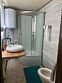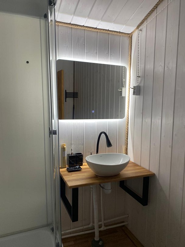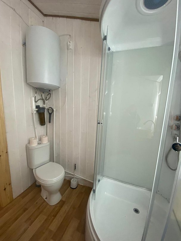 Ванная комната с душевой кабиной, раковиной, туалетом. Горячая и холодная вода.
