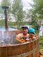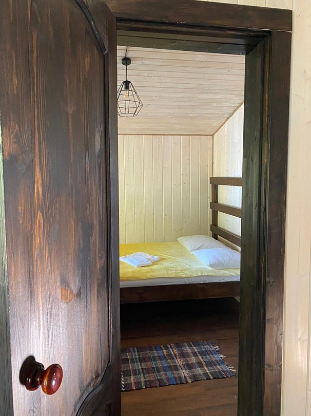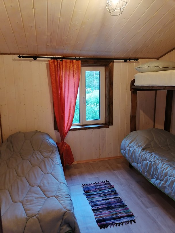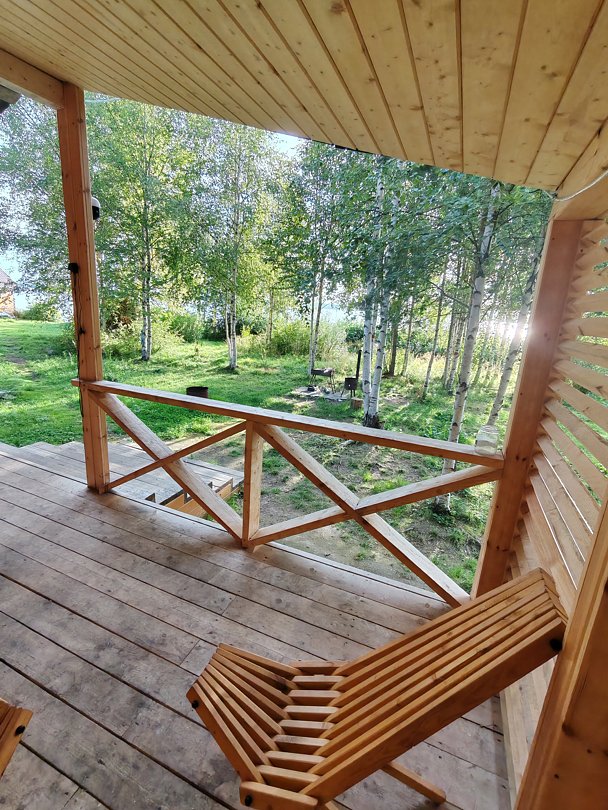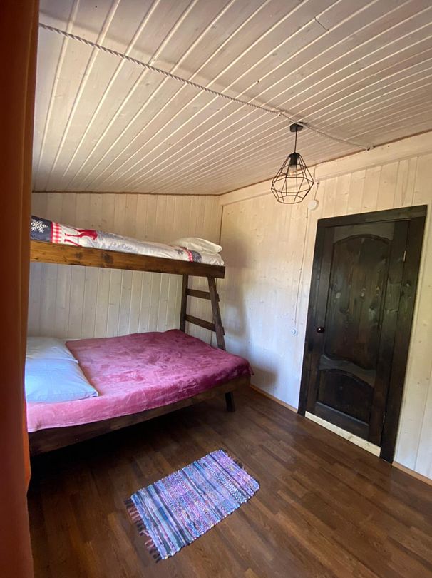 Дом подходит для большой компании, есть 3 спальные комнаты (кровати односпальные, но можно удобно сдвигать), небольшая кухня гостиная с драскладным диваном. На втором этаже большая кровать и двухьярусная. Огромная крытая веранда с видом на озеро, мангальная зона, а так же есть баня Фурако (горячая купель), есть аренда лодок.