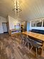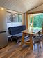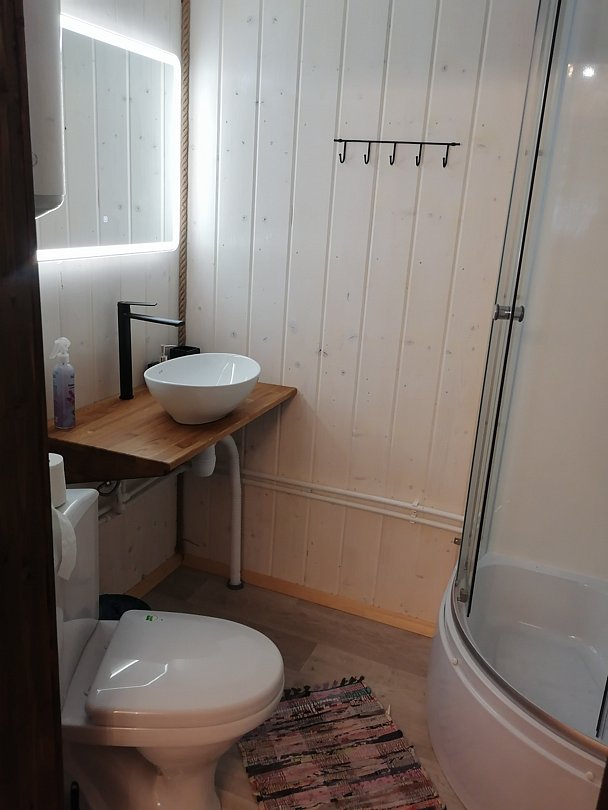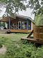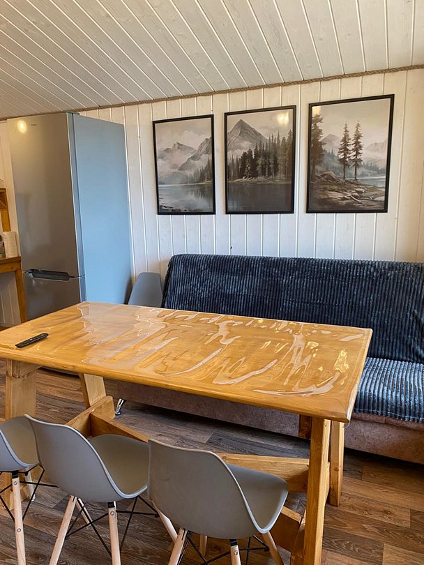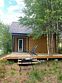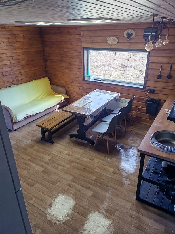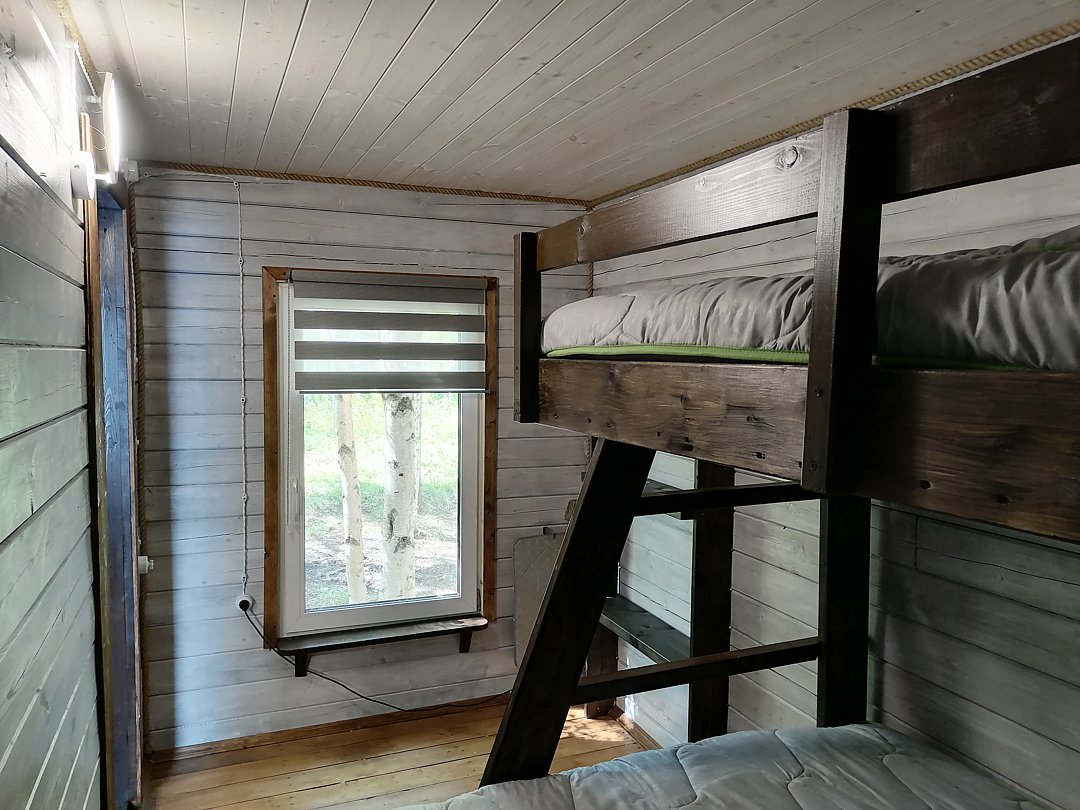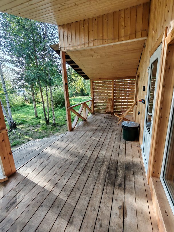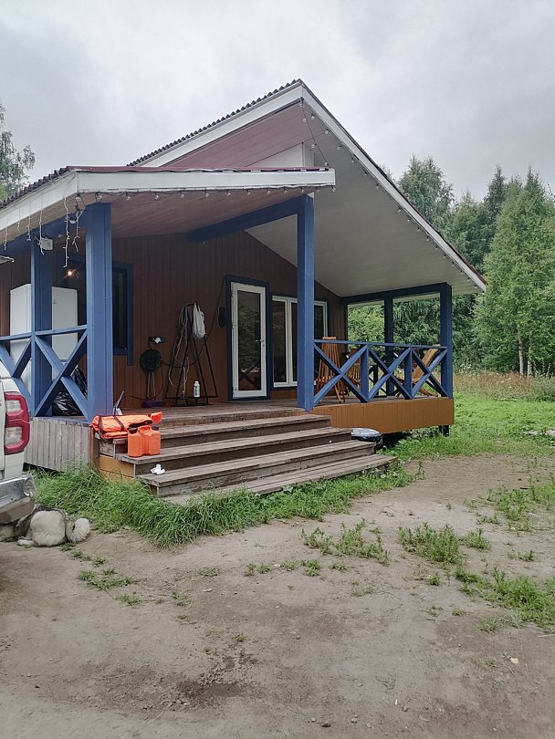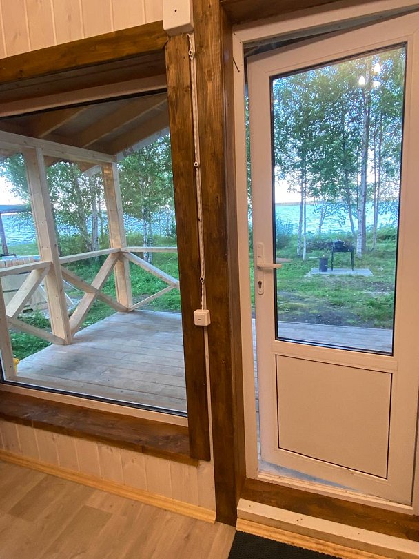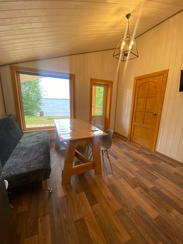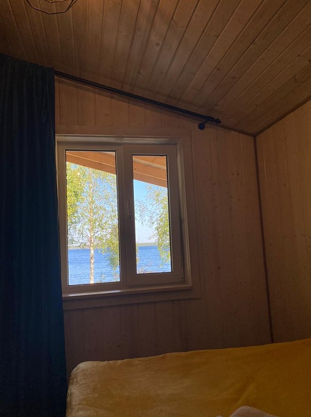 Полноценный одноэтажный комфортабельный дом, расположенный в 15 метрах от воды. С двумя спальнями. В одной двух-местная кровать с видом на озеро. В другой спальне двухьярусная кровать и односпальная вид на улицу. На первом этаже кухня-гостиная с панорамным окном, столом со стульями и раскладным диваном. Также,есть душевая с туалетом, горячая и холодная вода. Большая терраса с видом на озеро оборудована уличной мебелью.