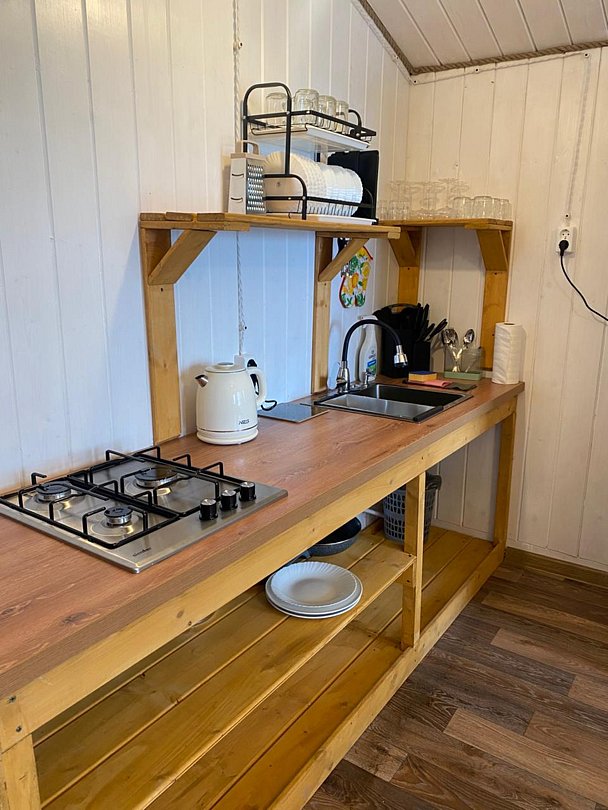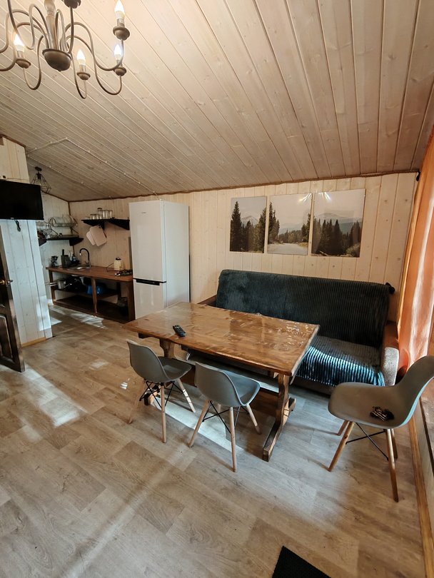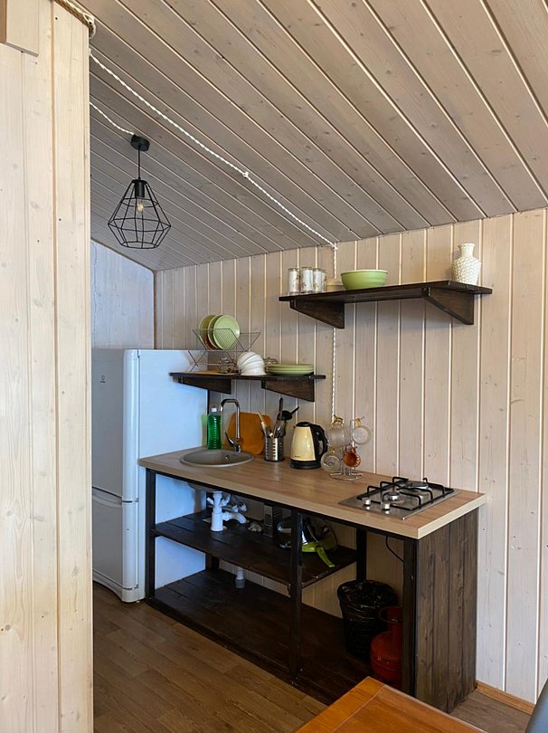 Кухня-гостиная с диваном. Кухня оборудована раковиной, газовой поверхностью, холодильником, электрочайником. Вся необходимая посуда. Стол и стулья.