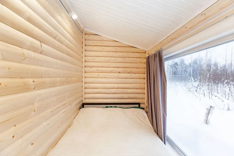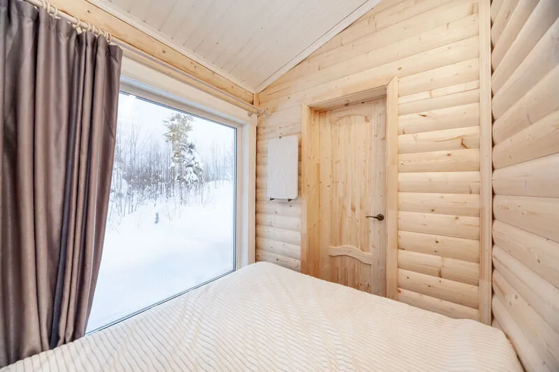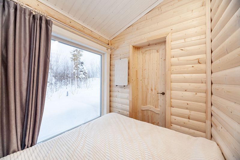 Уютная спальня с большим панорамным окном, откуда открывается завораживающий вид на величественный лес, двухместный диван, полный набор столовых приборов, мангал, шампуры и вся необходимая посуда для идеального отдыха.