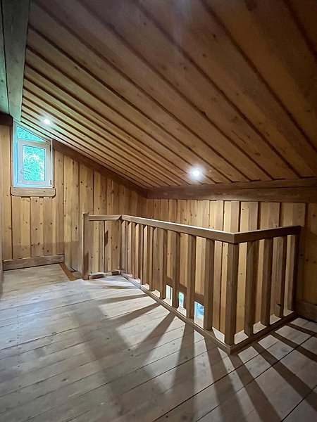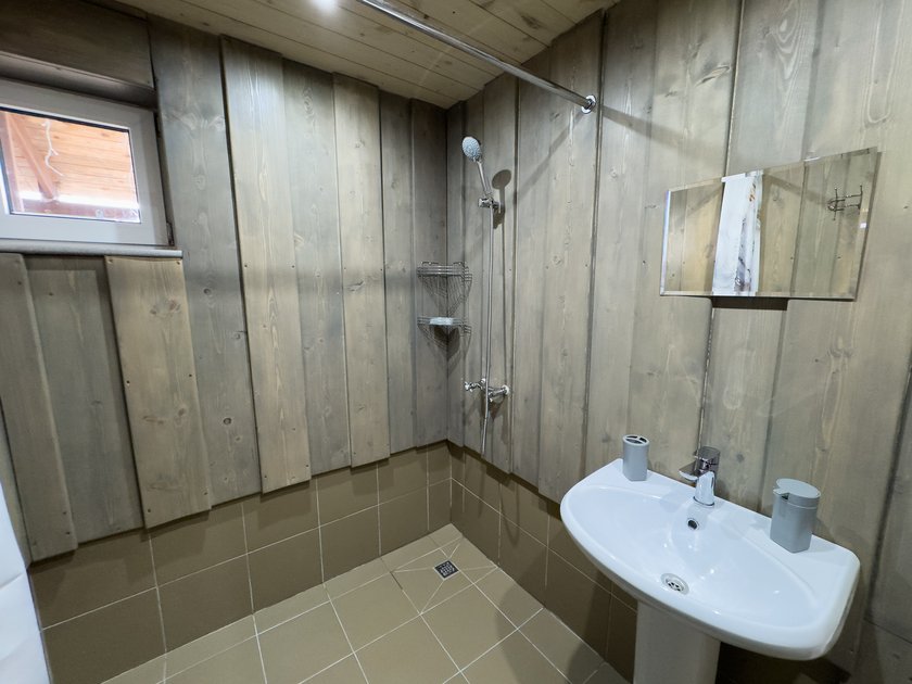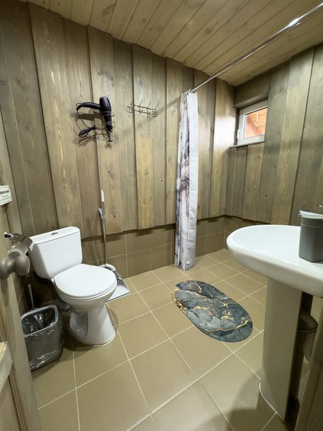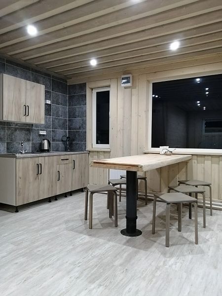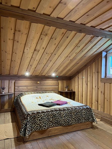 Внутренняя отделка дома выполнена натуральными материалами из сосновых и еловых массивов, что позволяет чувствовать лёгкий древесный аромат и проникнуться атмосферой. На территории расположена баня и мангал. Есть Wi-Fi.