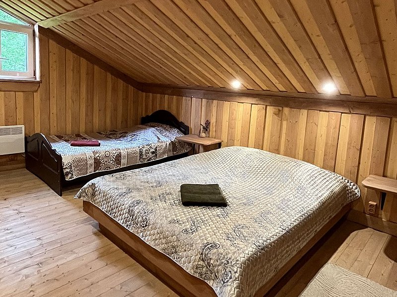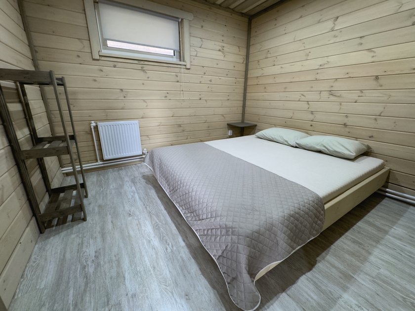 На первом этаже расположена комната-студия с оборудованной кухонной зоной и двухместной тахтой. На втором этаже 3 спальни: в первой спальне двухместная кровать, во второй двухместная и полуторная, а в третьей — двухместная и односпальная кровати.