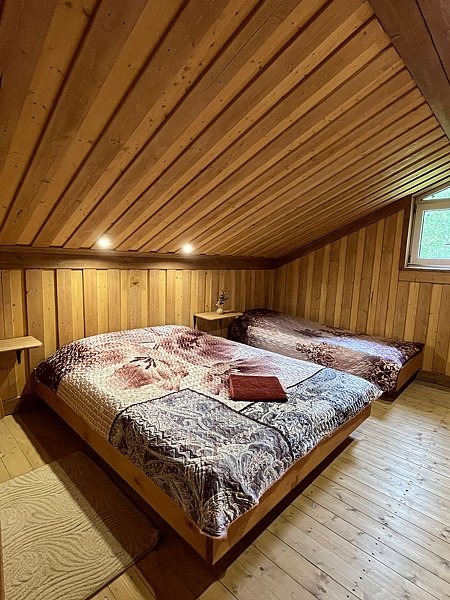 В доме 2 спальни с двуспальными кроватями, дополнительные спальные места на двуспальном диване (часть комнаты зонирована) . По запросу предоставляется детская кроватка.