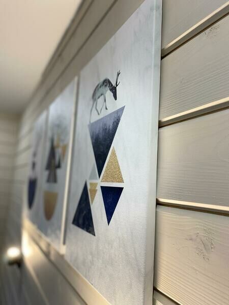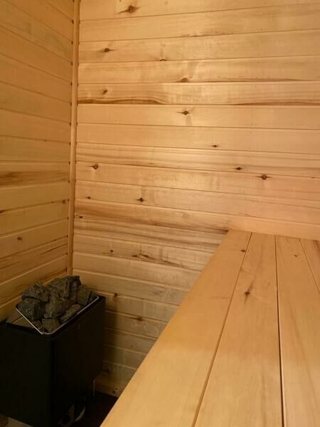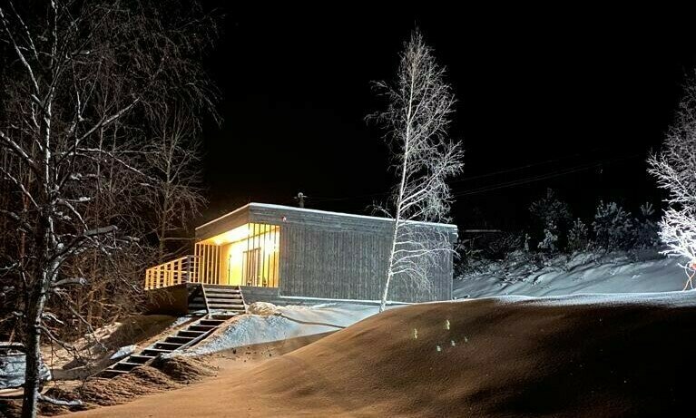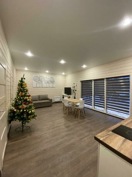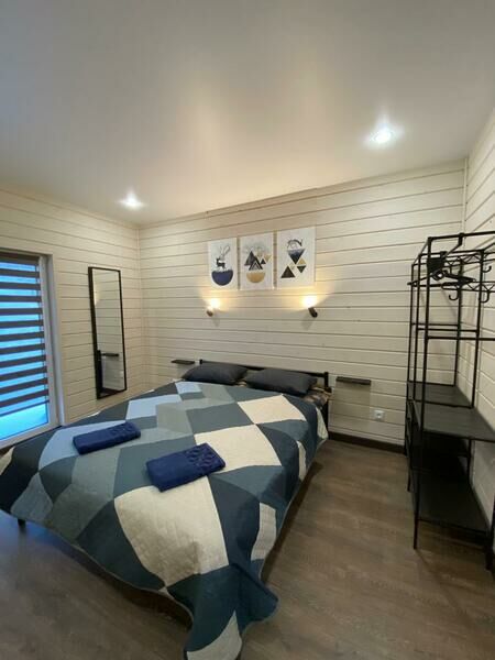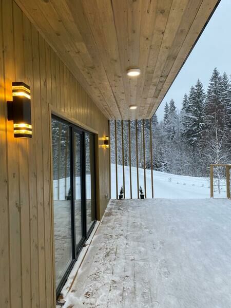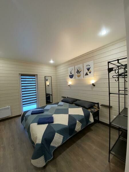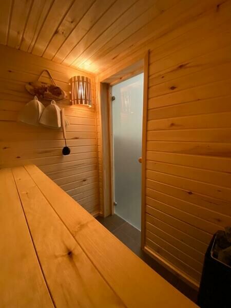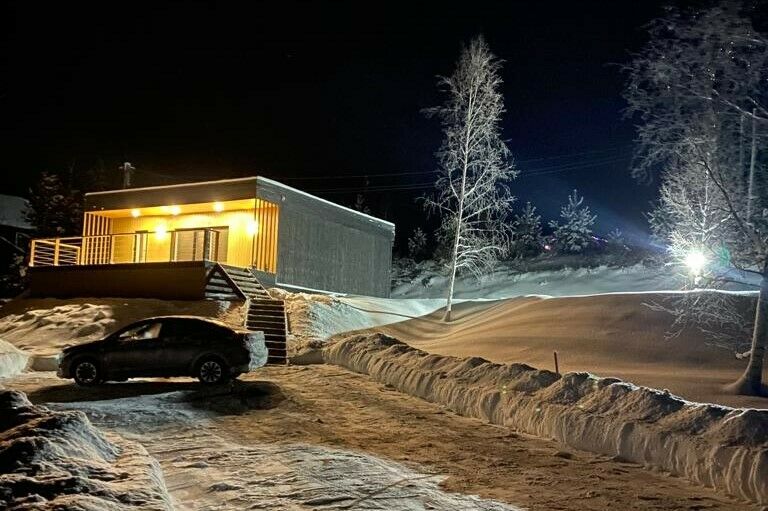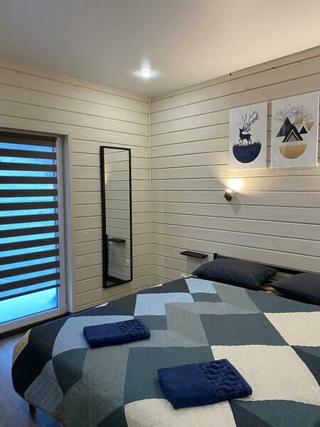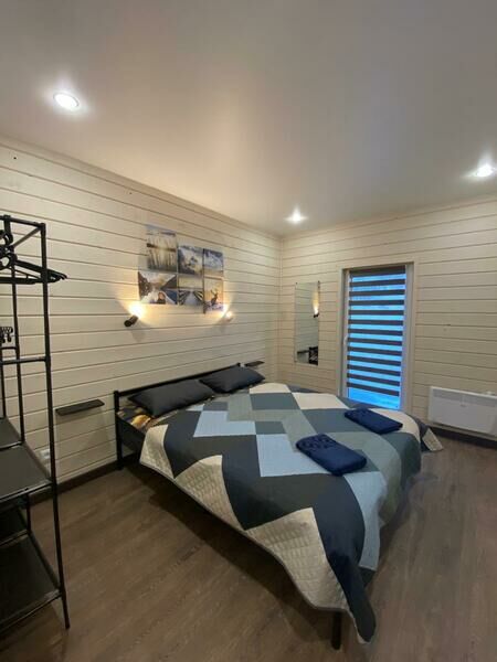 У дома есть панорамное остекление и терраса 30 кв.м с размещением 6 человек. Планировка дома состоит из двух изолированных спальней с двуспальной кроватью, кухни, совмещённой с гостиной с двуспальным диваном, душевой комнаты и санузла, собственной сауны.
