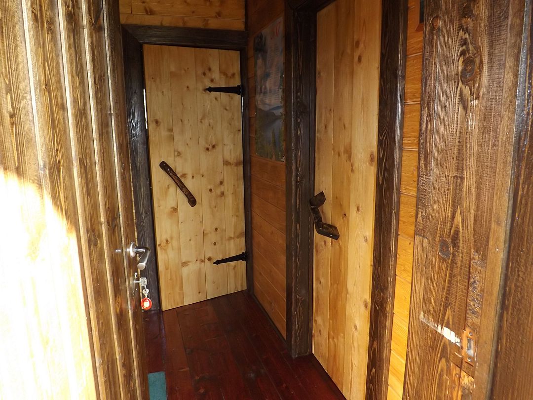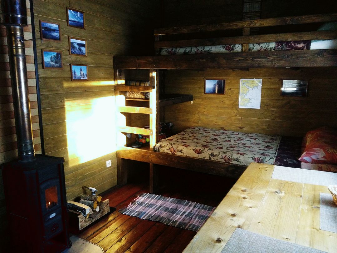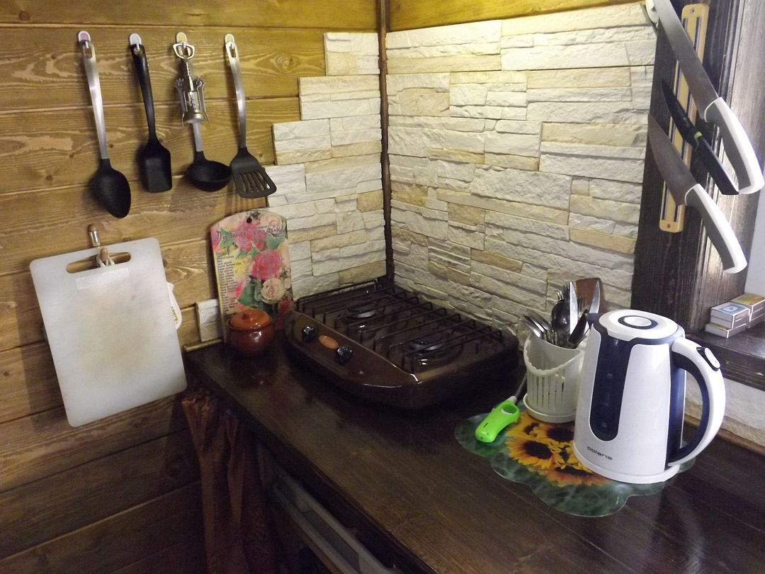 В домике имеется прихожая, санузел с унитазом и душем, комната с мини кухней, двуярусной кроватью на 4 человека и открытая веранда со столом.