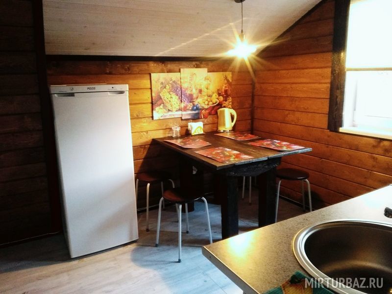 Благодаря удачному расположению тут практически нет ветров и солнечно. Здесь Вы найдете развлечения на любой вкус. Прогуляться по берегу, порыбачить с пирса или с лодки, пособирать грибы и ягоды. Перед домиками есть лужайка для игр (баскетбол, волейбол, дартс, бадминтон). В зимний период склон для ватрушки. Также гостям доступна баня. Площадь домиков 30 и 50 м². В маленьком домике имеется прихожая, санузел, комната с мини кухней, двухъярусной кроватью на 4 человека и открытая веранда со столом. В наличии мангал и казан.