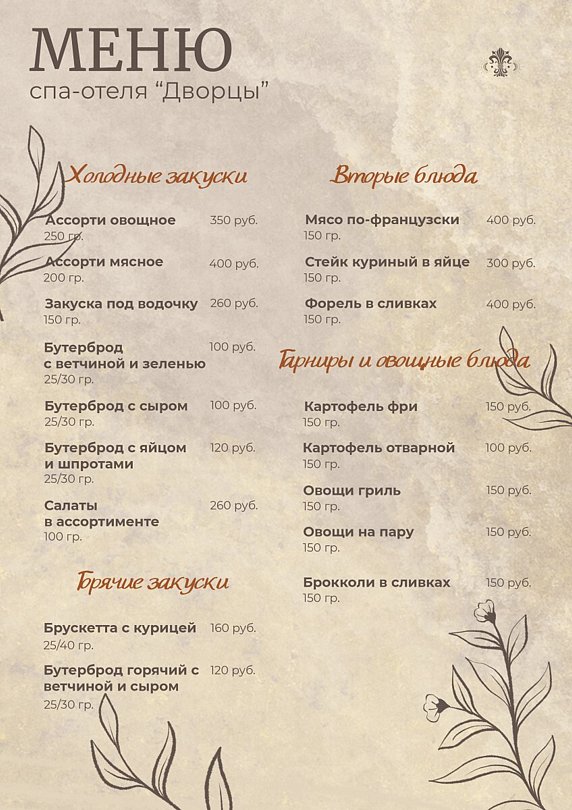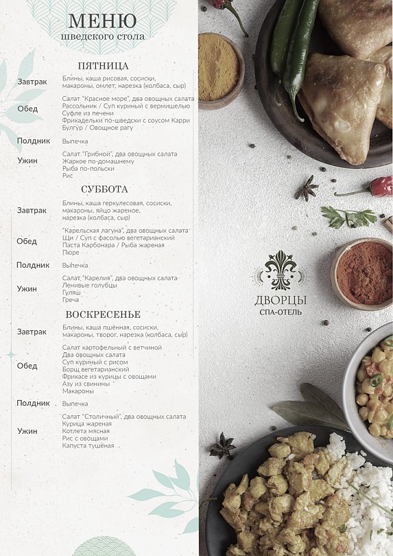 Тип меню: европейская кухня, русская кухняВ уютном и просторном ресторане спа-отеля «Дворцы» предлагается разнообразное четырехразовое питание по принципу шведского стола. Посетителей порадуют фирменные блюда европейской, русской и карельской кухонь, выполненные профессиональными шеф-поварами.