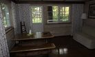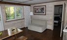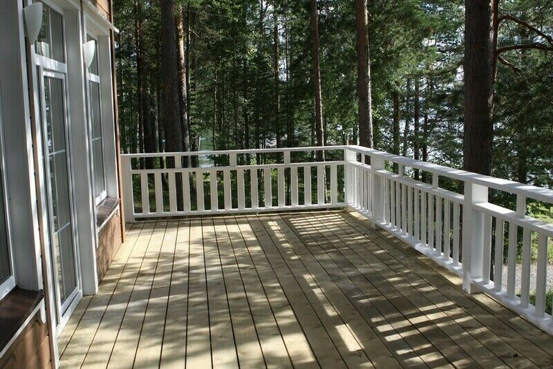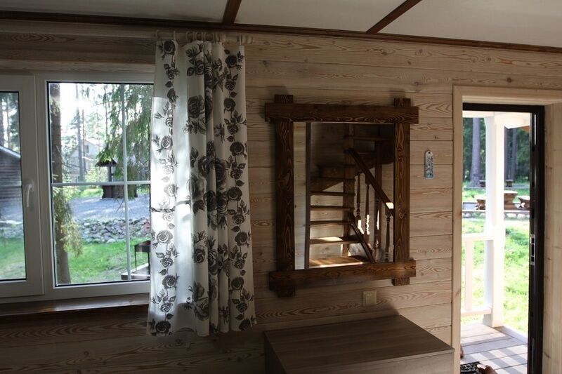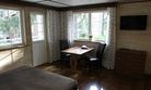 В кухне: кухонный гарнитур, холодильник, микроволновая печь, плита на 4 конфорки, электрочайник, кофеварка, тостер, набор посуды и кухонной утвари, раковина. Благодаря береговому расположению гостиная и терраса коттеджа выходят на озеро и берег, окруженный соснами.
