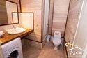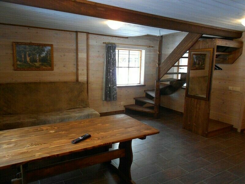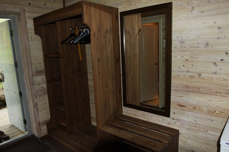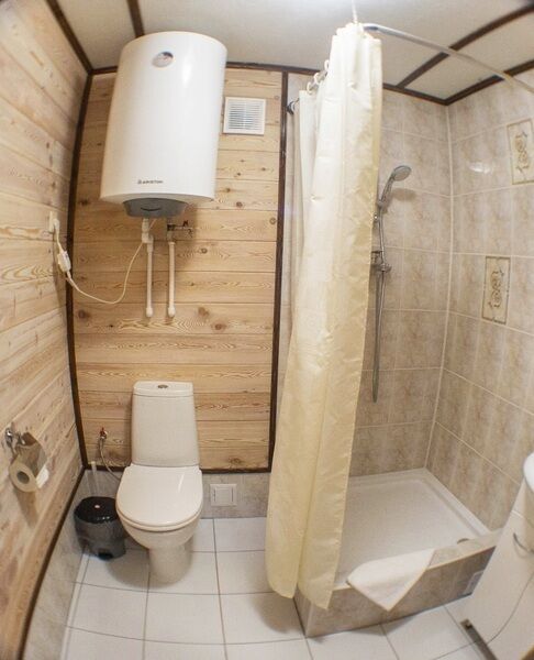 - Кухня/гостиная: холодильник, микроволновая печь, плита на 2 конфорки, электрочайник, набор посуды и кухонной утвари, раковина, обеденная зона (лавки, стол), диван (раскладной, может служить дополнительным местом), ЖК-телевизор, гардероб, зеркало, балкон;