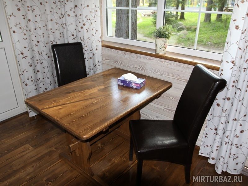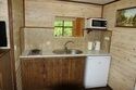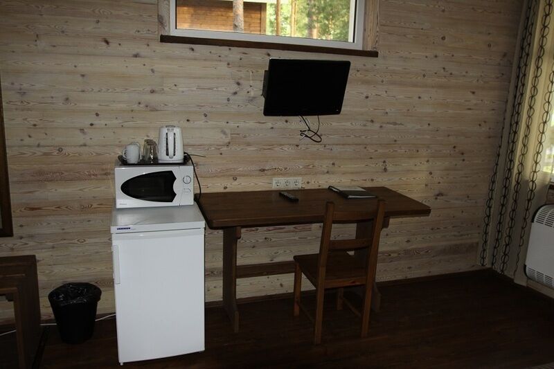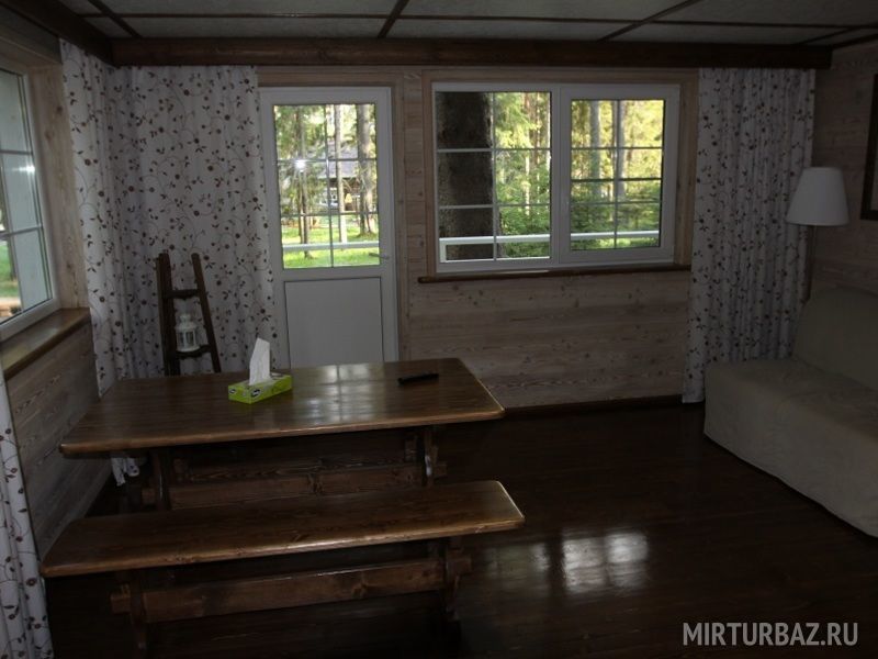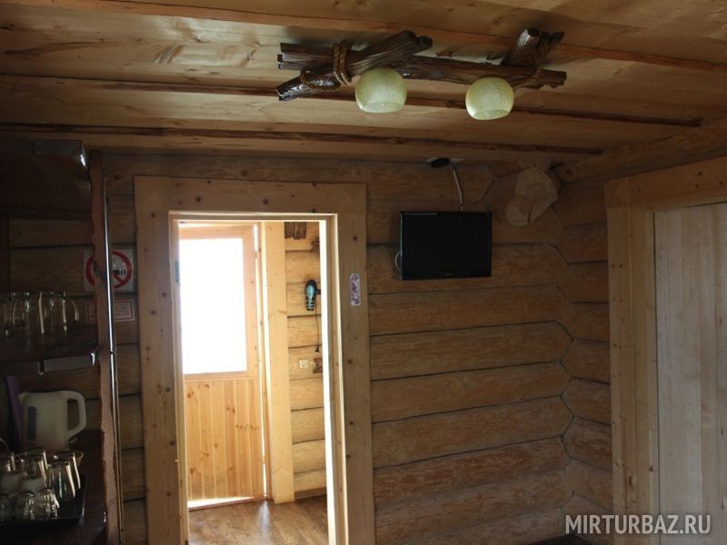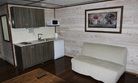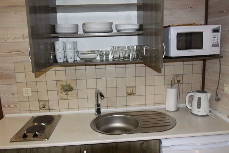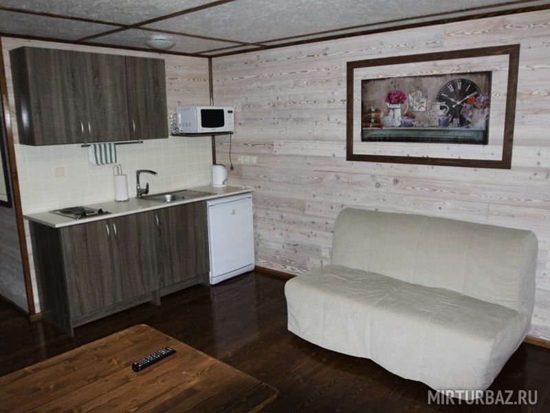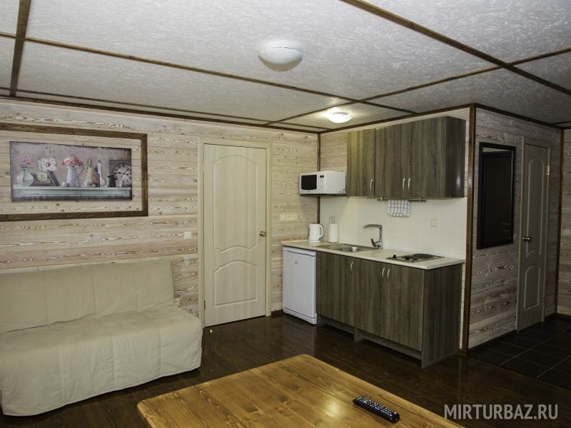 - Кухня/гостиная: холодильник, микроволновая печь, плита на две конфорки, электрочайник, набор посуды и кухонной утвари, раковина, обеденная зона (стол, лавки), ЖК-телевизор, диван (раскладной, может использоваться как дополнительное место), гардероб, зеркало, балкон.