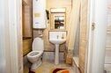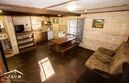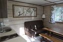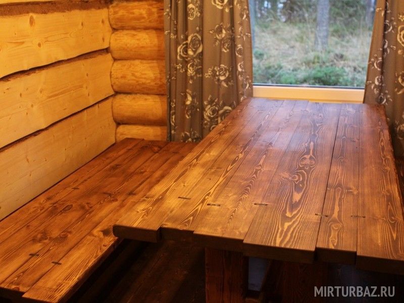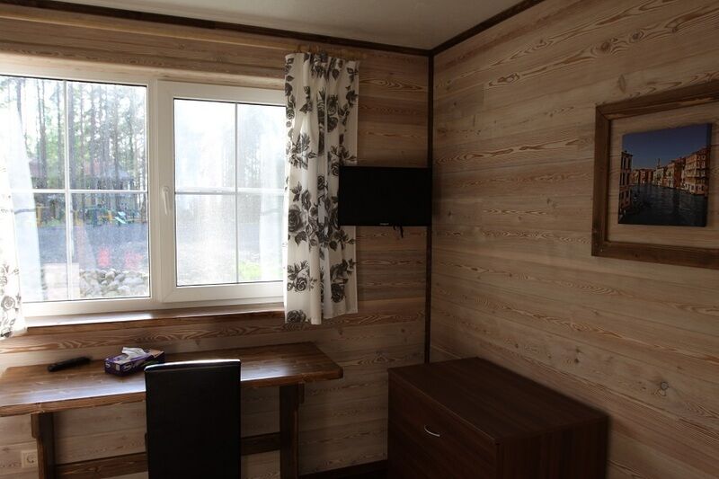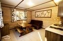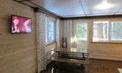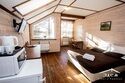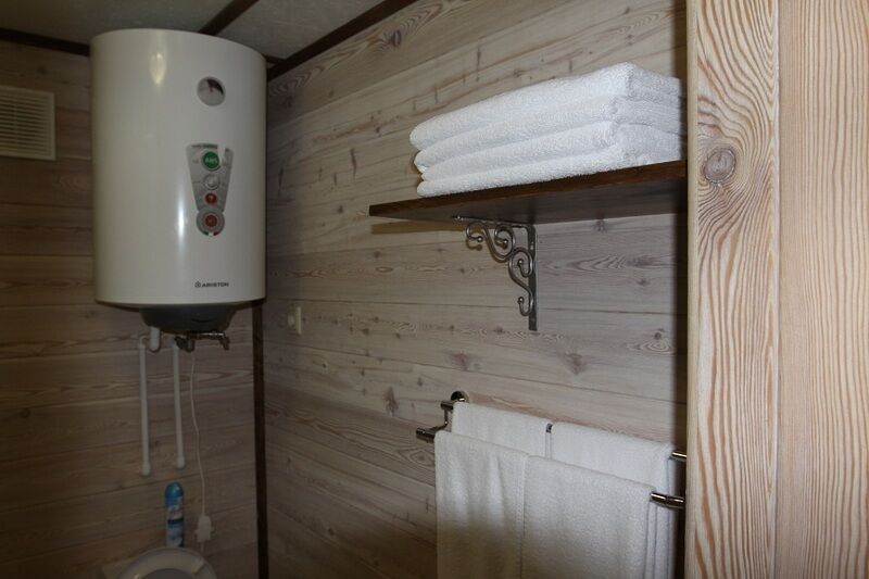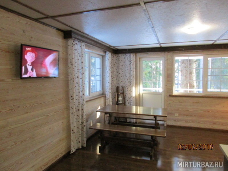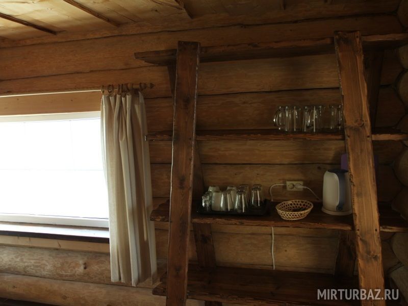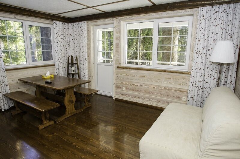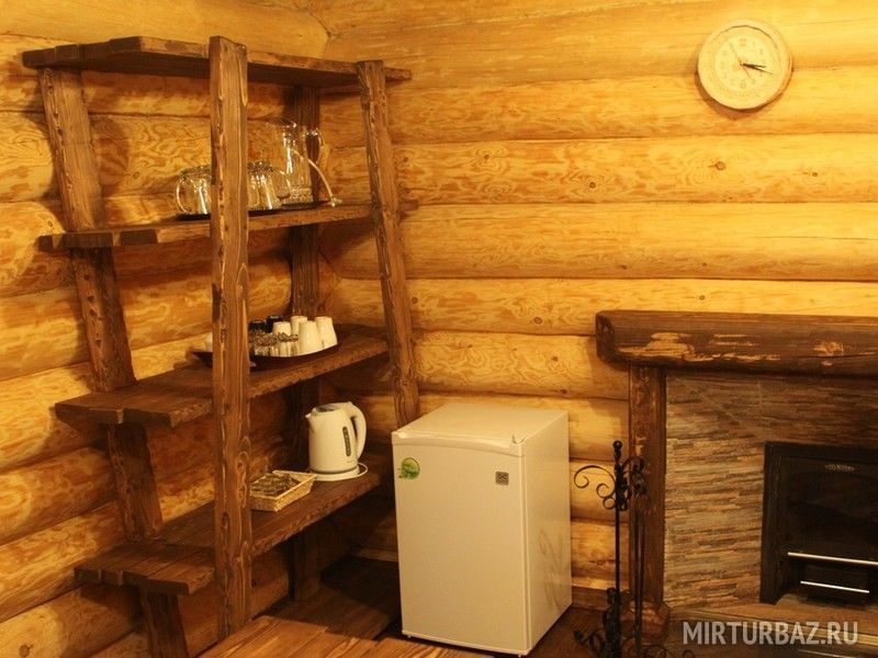 - Кухня/гостиная: холодильник, микроволновая печь, плита на две конфорки, электрочайник, набор посуды и кухонной утвари, раковина, обеденная зона (стол, лавки), ЖК-телевизор, диван (раскладной, может использоваться как дополнительное место), гардероб, зеркало, балкон.