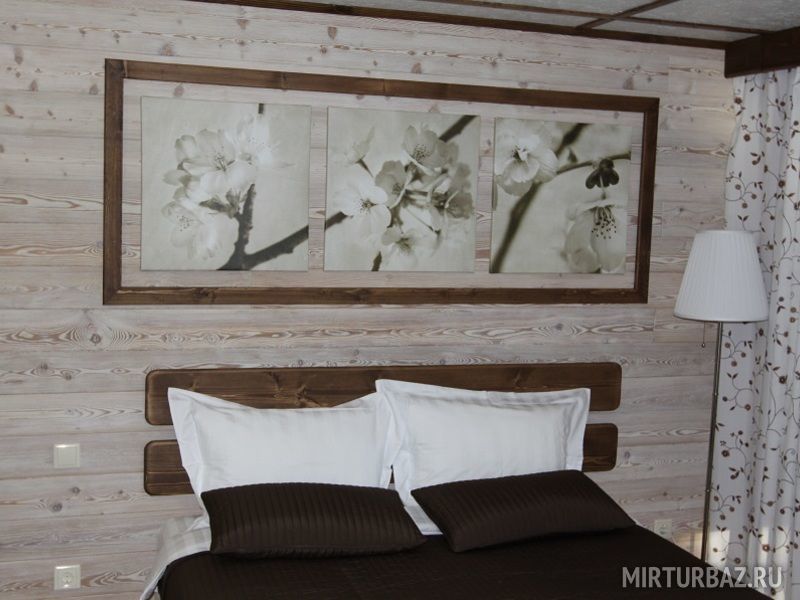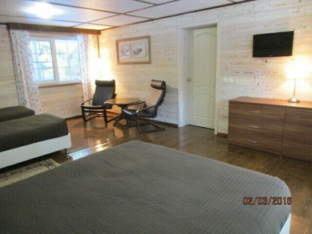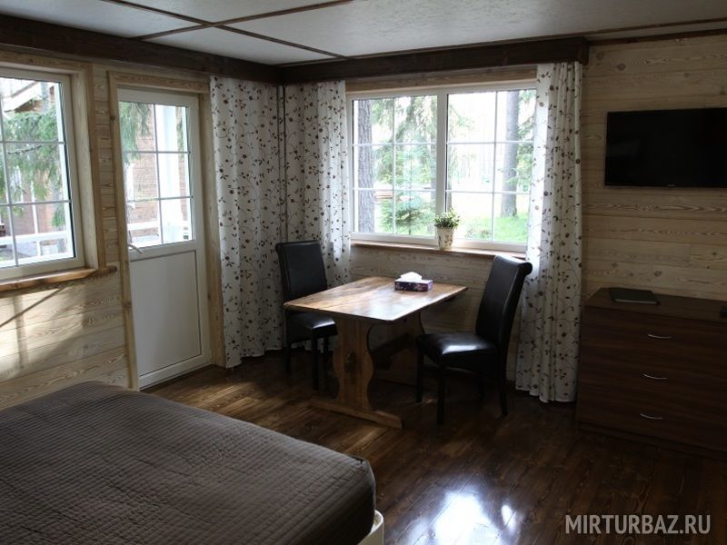 В номере: двуспальная кровать (2000*1600 мм), холодильник, прикроватные тумбы, ж/к телевизор с DVD-проигрывателем, бра, рабочий стол, обеденный стол, 3 стула, электрочайник, микроволновая печь, набор посуды на 3 человека, гардероб, зеркало, полный санузел, балкон, отдельный вход.