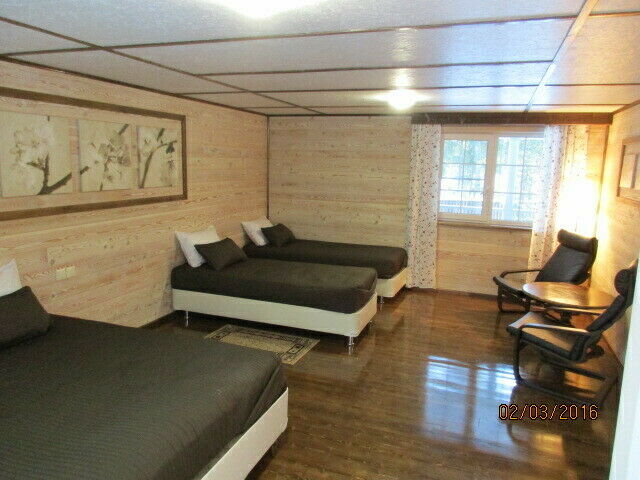 - Спальня: двухспальная кровать (2000х1600 мм) две односпальные кровати, ЖК-телевизор, тумбы прикроватные, комод, два кресла, журнальный столик, балкон.