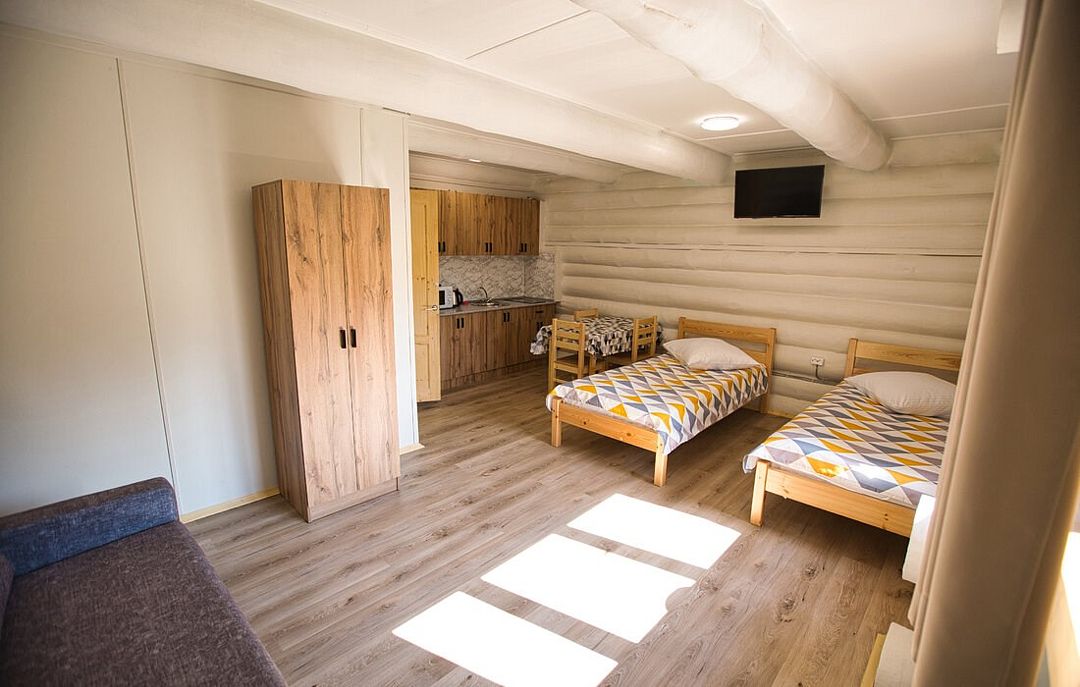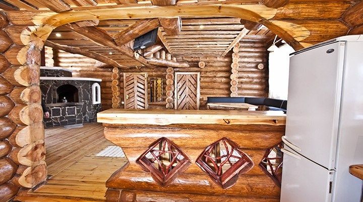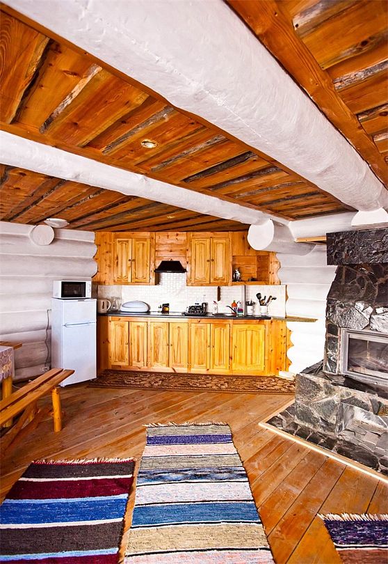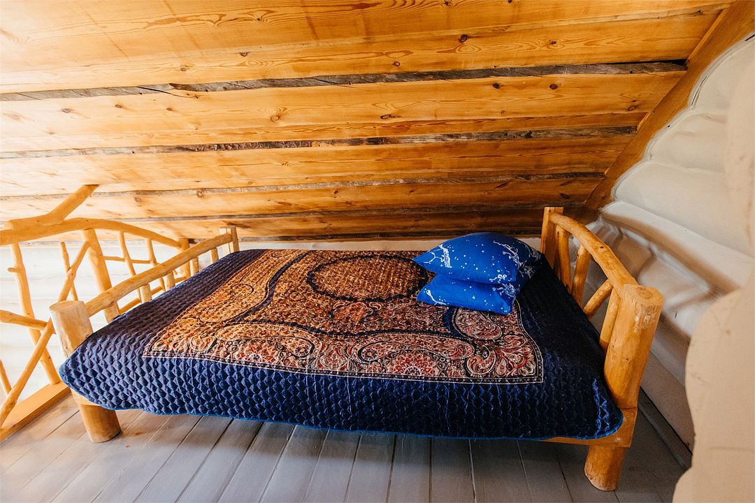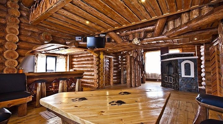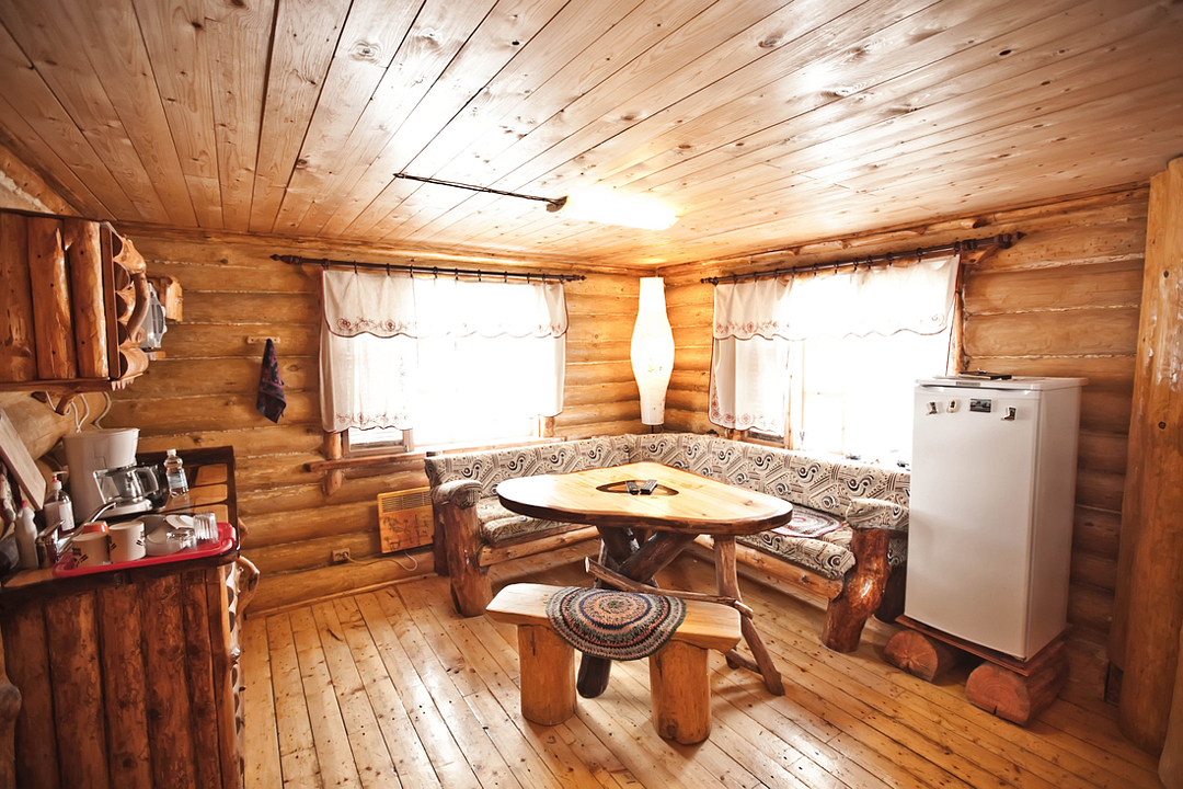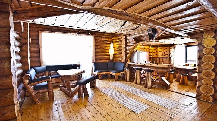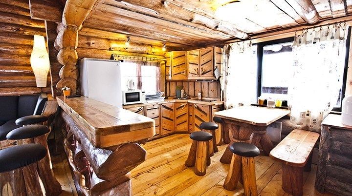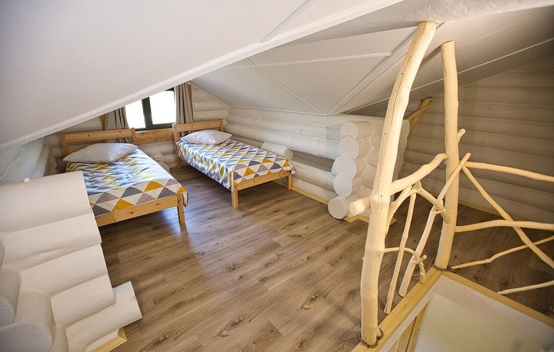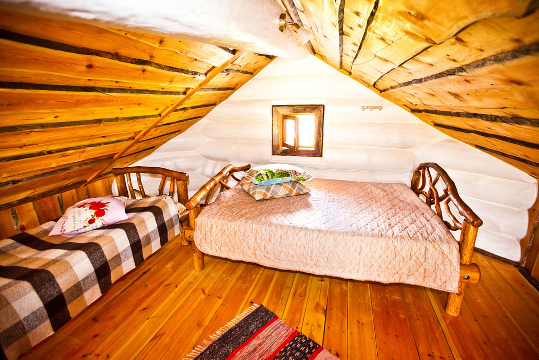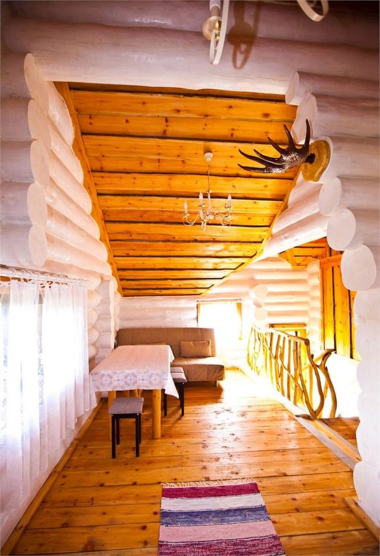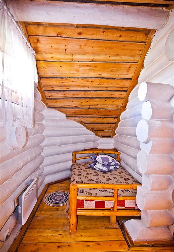 Первый этаж избы отведен под кухню со всем необходимым. Есть посуда, холодильник, СВЧ, плита, электрочайник. Рядом находится гостиная с телевизором. На первом этаже есть и настоящая дровяная сауна, в которой очень приятно расслабиться после эмоционального дня. Второй этаж избы отведен под спальни. В них установлены три двухместных кровати, есть одна одноместная.