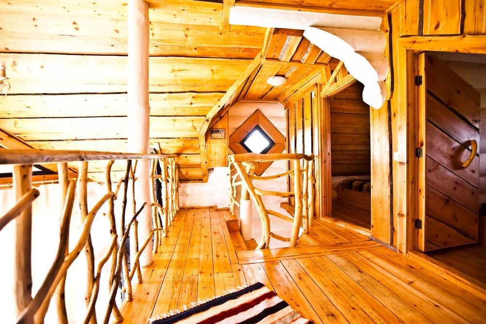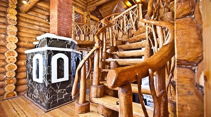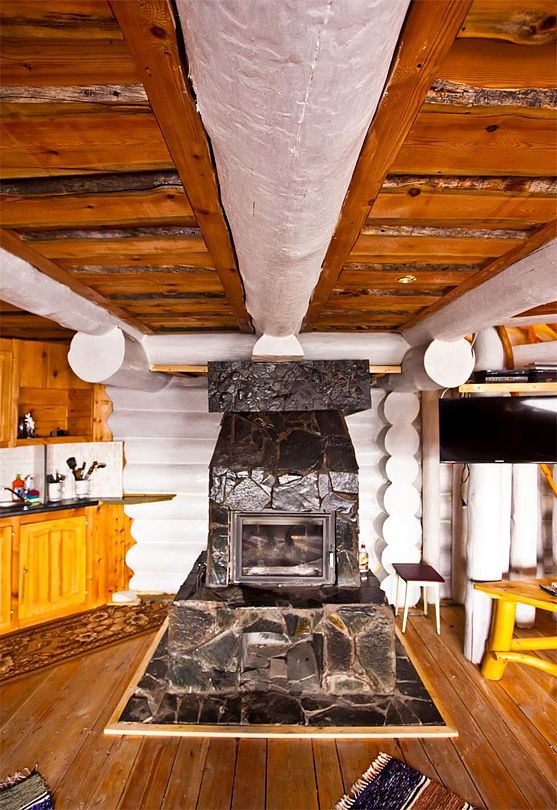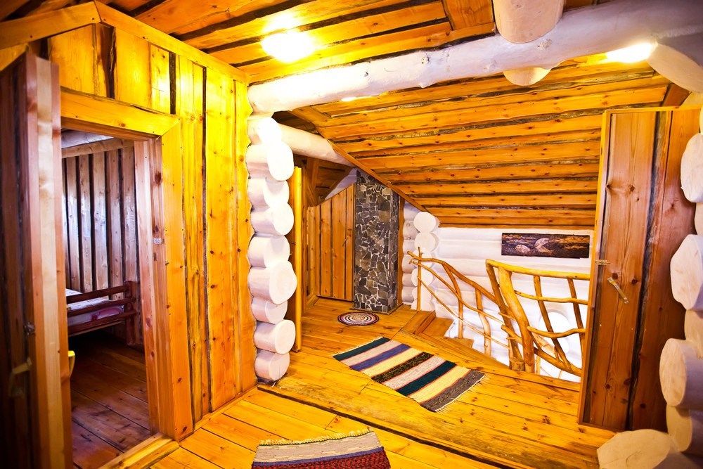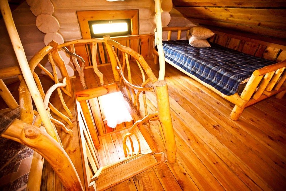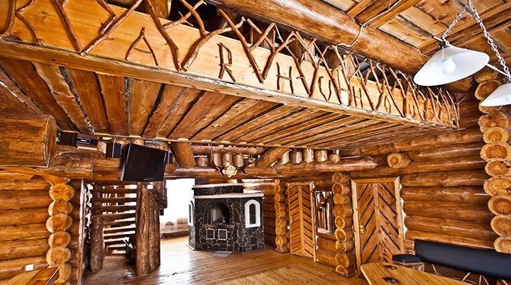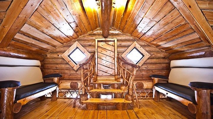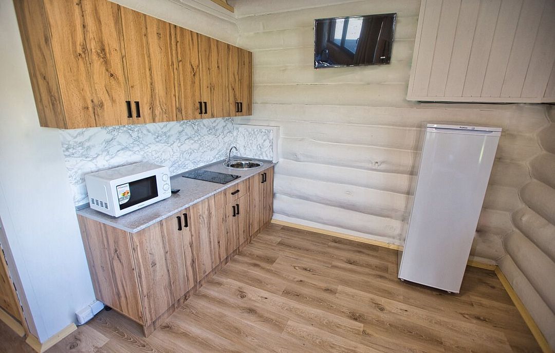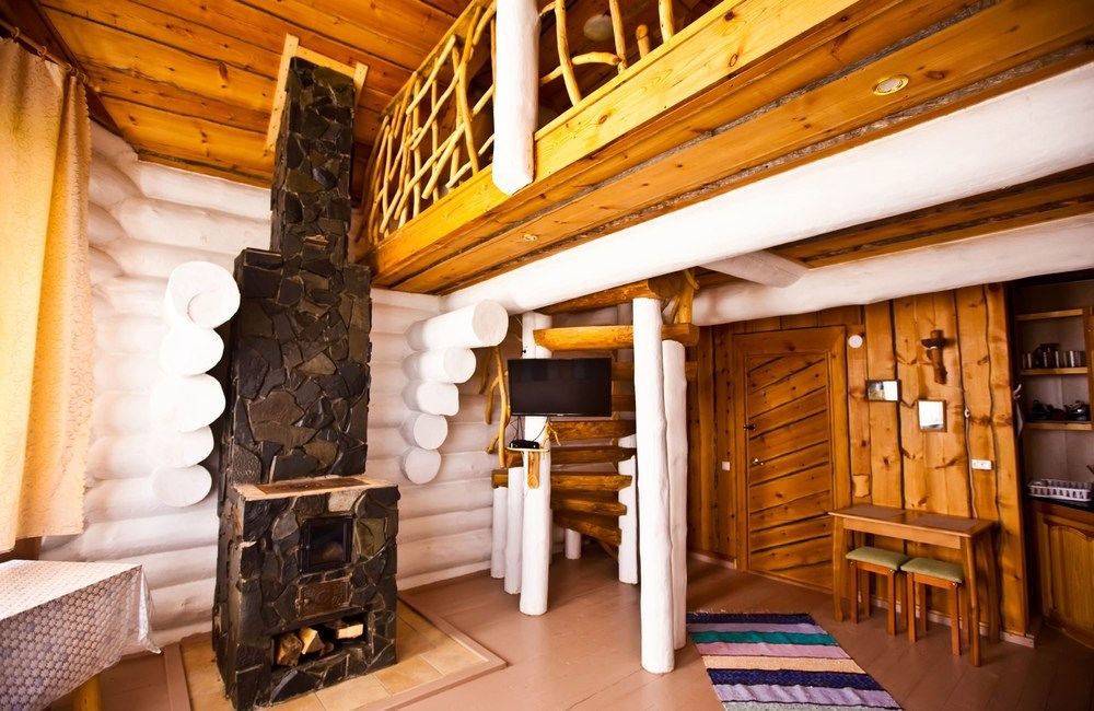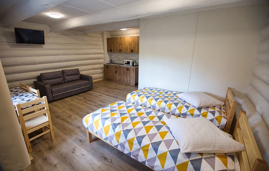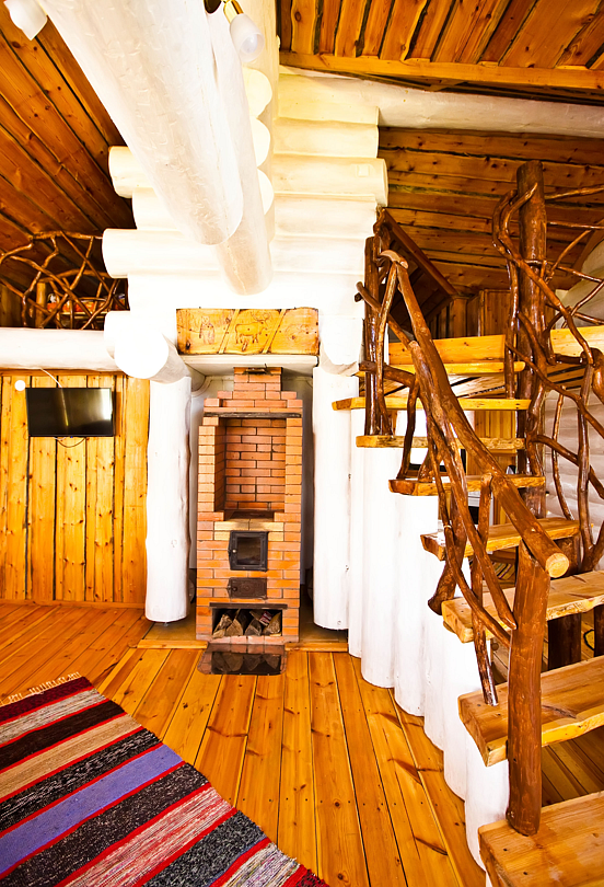 Первый этаж избы отведен под кухню со всем необходимым. Есть посуда, холодильник, СВЧ, плита, электрочайник. Рядом находится гостиная с телевизором. На первом этаже есть и настоящая дровяная сауна, в которой очень приятно расслабиться после эмоционального дня. Второй этаж избы отведен под спальни. В них установлены три двухместных кровати, есть одна одноместная.