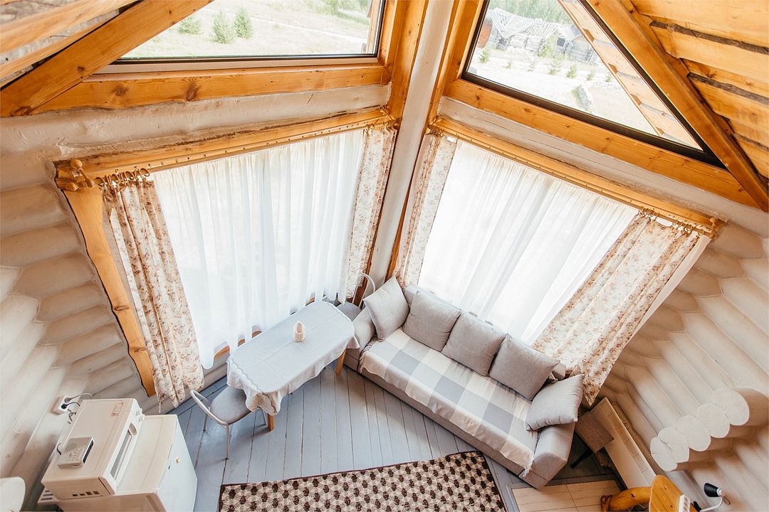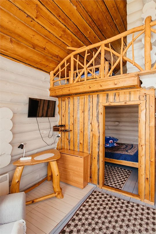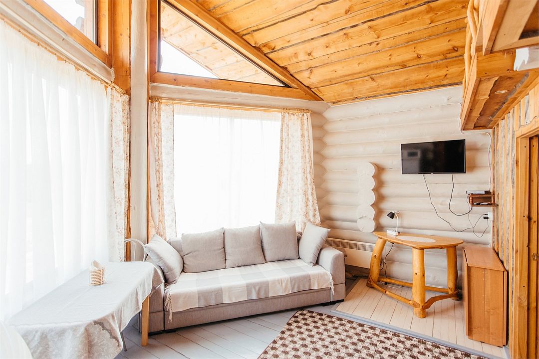 Изба «Солнечная» рассчитана на 8 человек. Два этажа деревянного сруба из карельской сосны спроектированы так, чтобы каждый гость чувствовал себя максимально удобно.