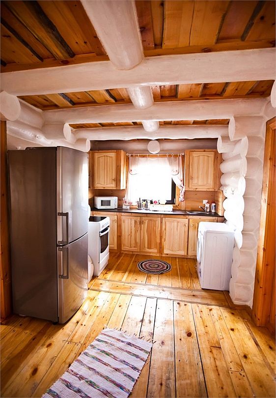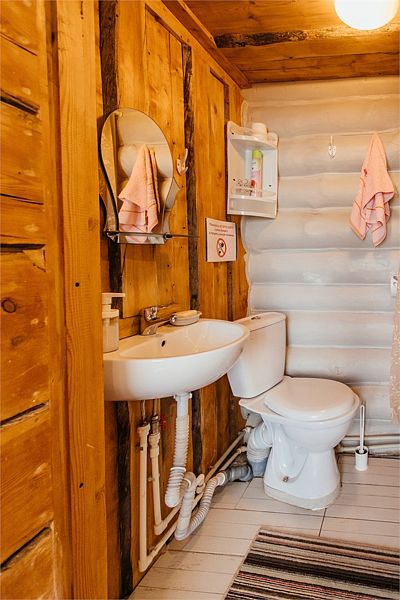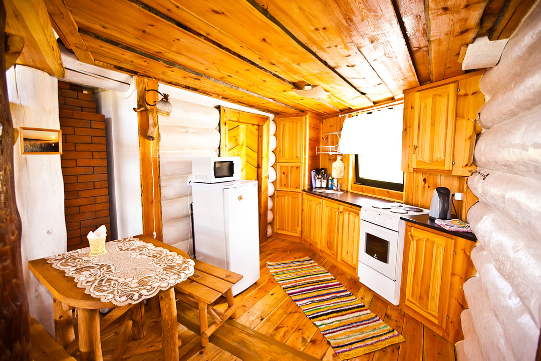 В избе есть все удобства – ванна, 2 туалета, оборудованная кухня с холодильником, печью СВЧ, плитой и полным набором утвари, посуды.