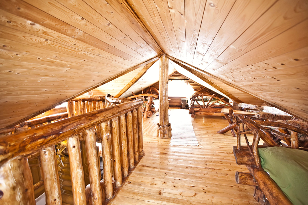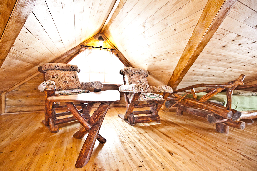 В доме находится пять спален (две на 1 этаже, две на втором), пятая спальня – в мансарде. Там же установлены односпальная и двуспальная кровати. Дополнительные места для ночлега обеспечивают три дивана, двуспальных – они установлены и на нижнем, и на втором этаже дома.