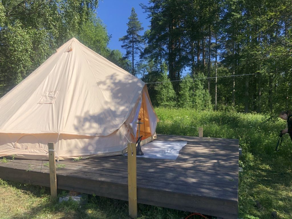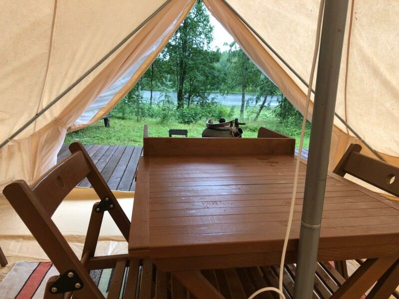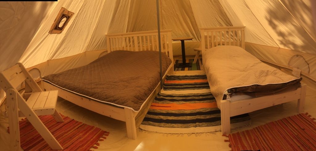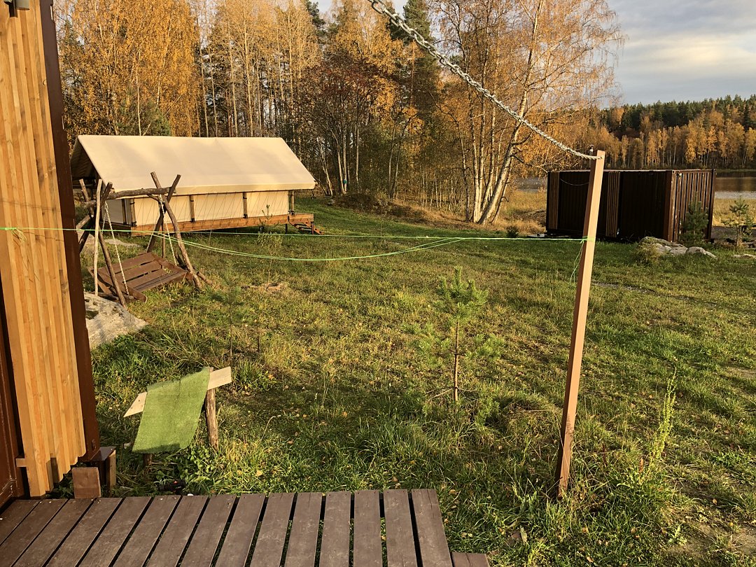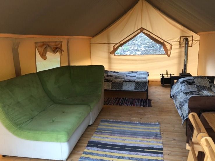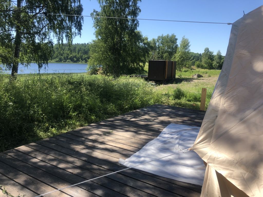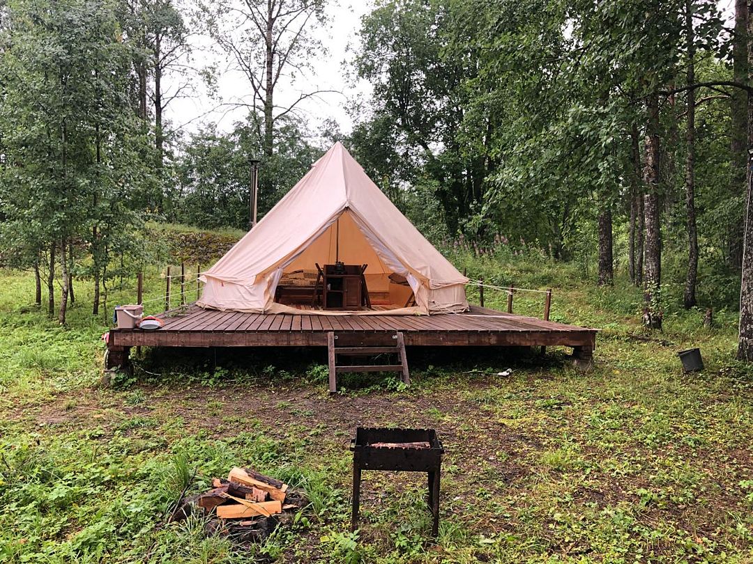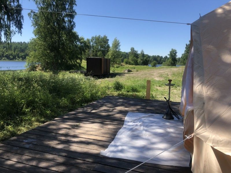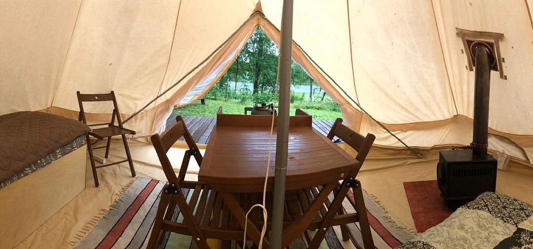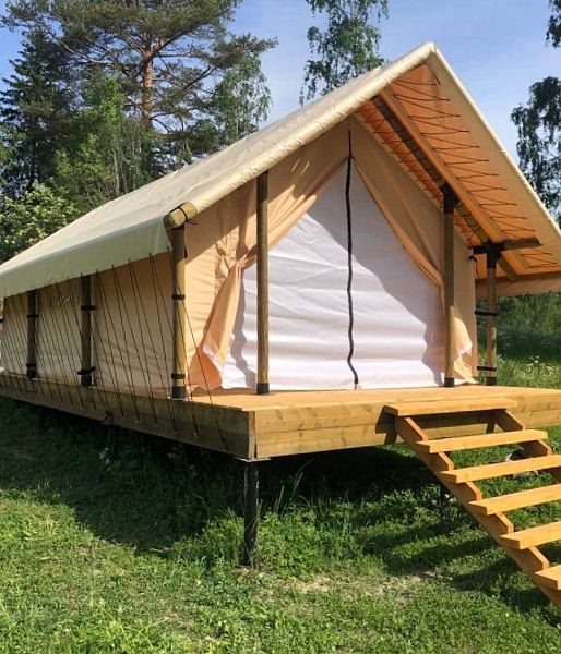 Просторный шатер на троих человек, возможно предоставление дополнительного спального места, в шатре имеется дровяная печь, газовая плита для приготовления пищи, стол, стулья, софа для комфортного расположения с видом на шхеру Ладоги. Предоставляется мангал, общая костровая зона.