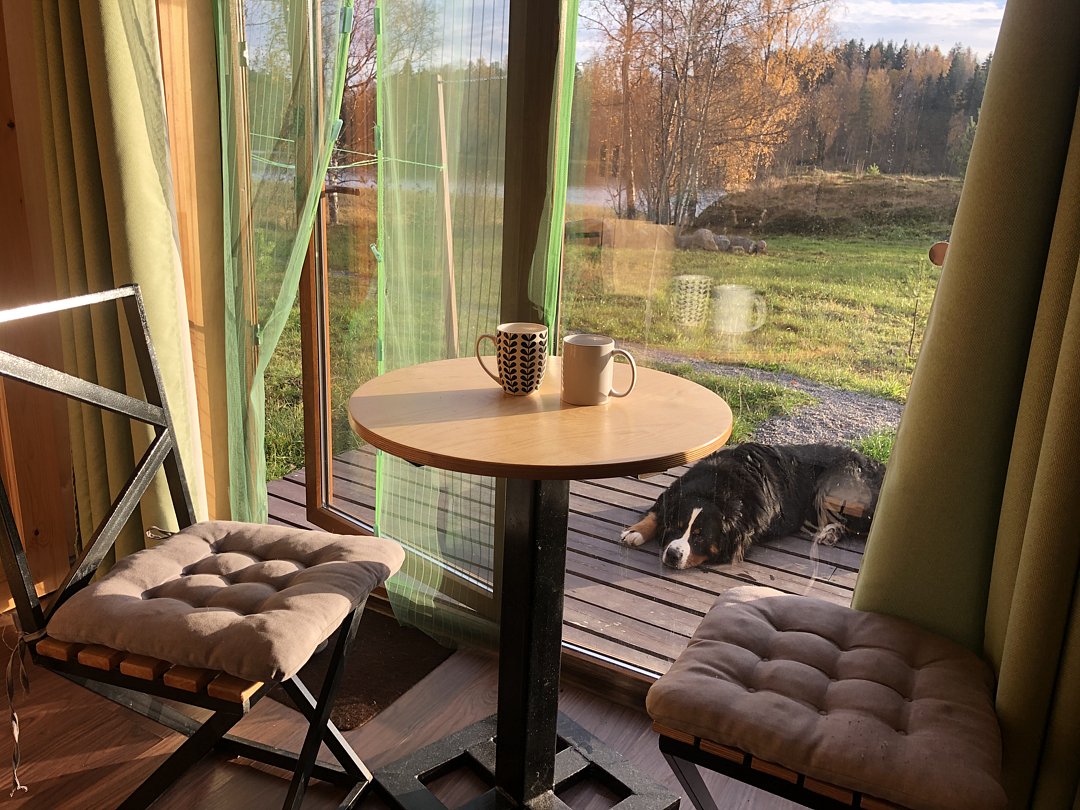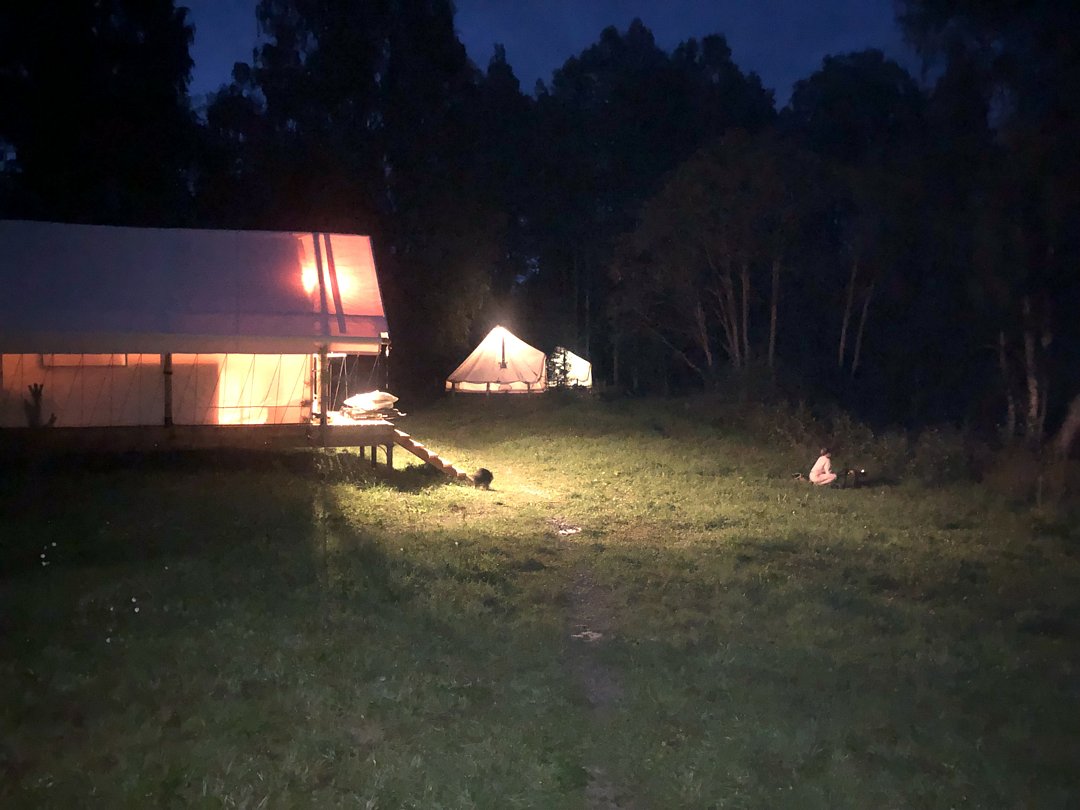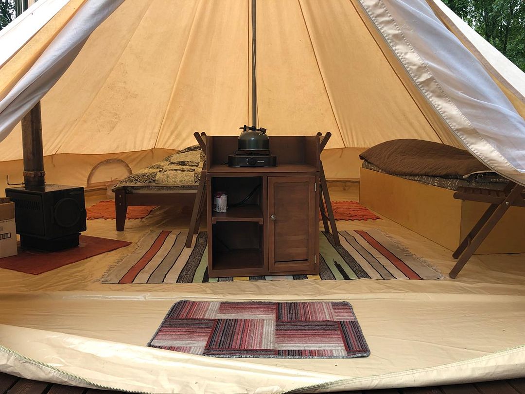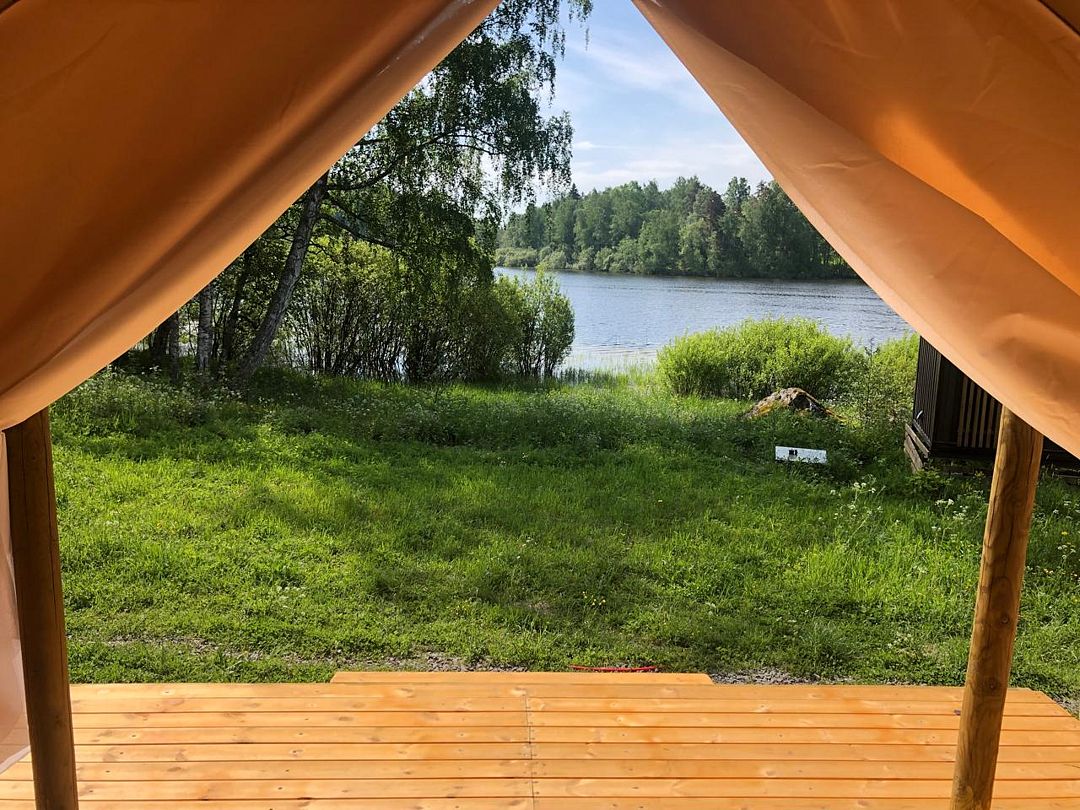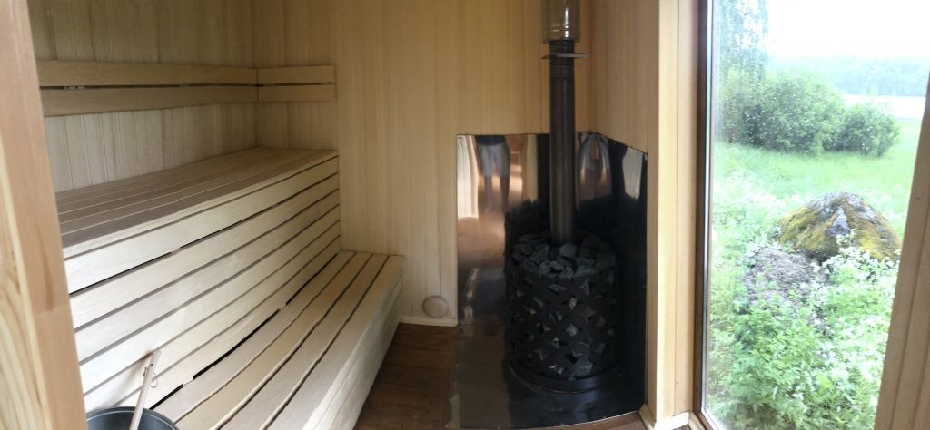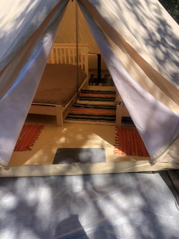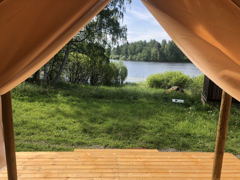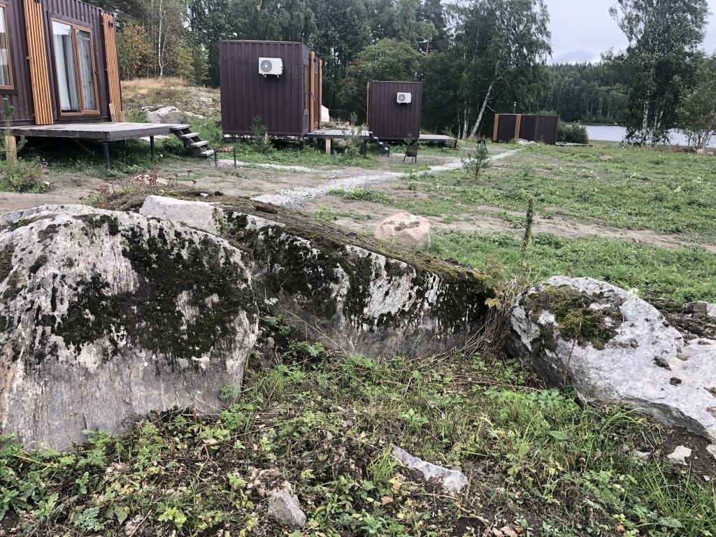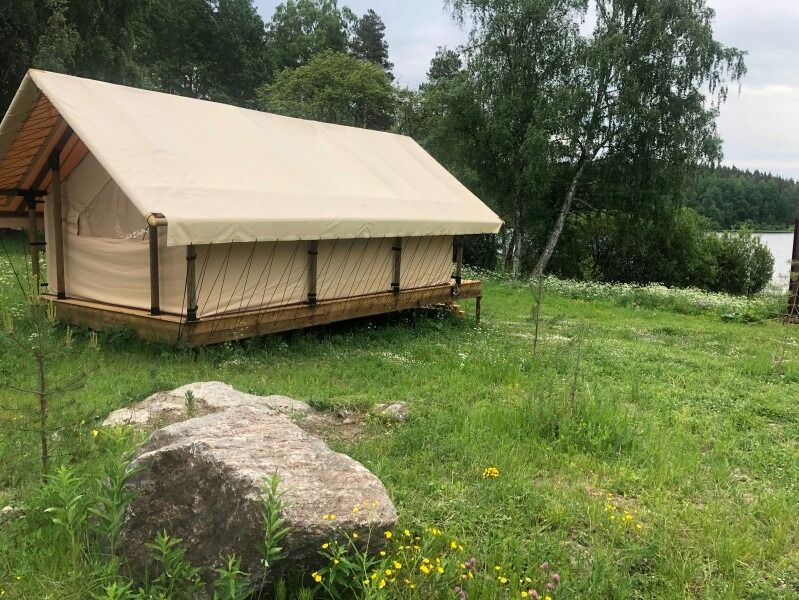 Просторный шатер на троих человек, возможно предоставление дополнительного спального места, в шатре имеется дровяная печь, газовая плита для приготовления пищи, стол, стулья, софа для комфортного расположения с видом на шхеру Ладоги. Предоставляется мангал, общая костровая зона.