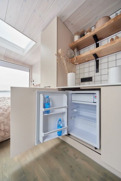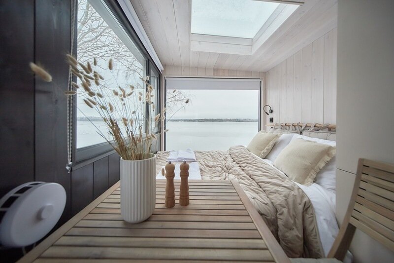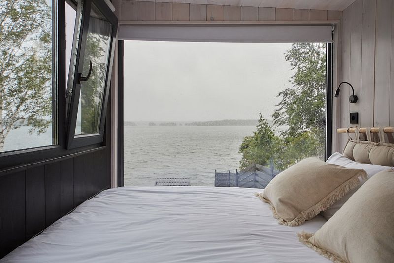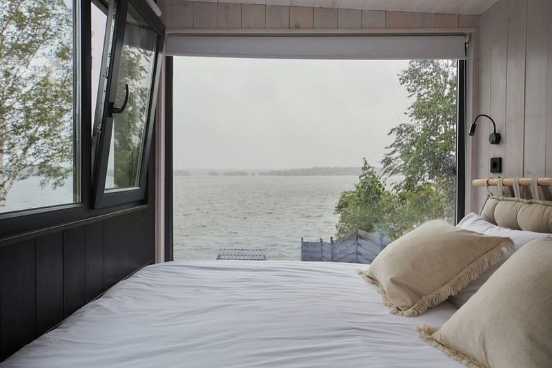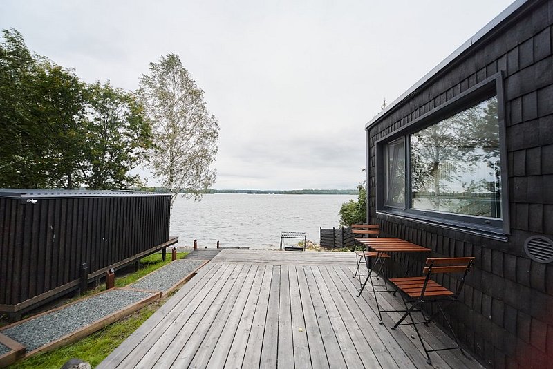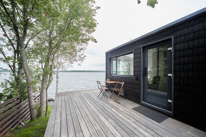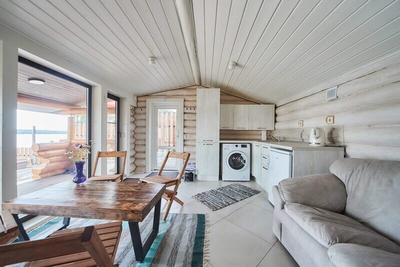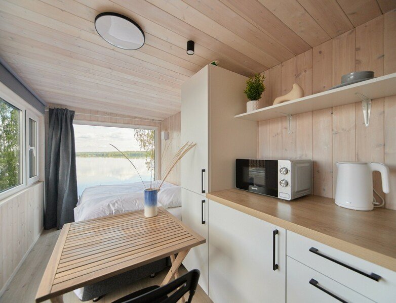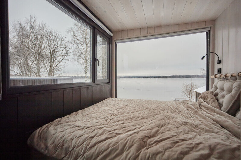 Экологичный деревянный домик полностью из карельской древесины, гипоаллергенные премиальные матрасы Аскона, премиальная косметика Botavikos, большая кровать 160*200, панорамное окно, душ и туалет, оборудованная кухня, а также большая терраса 18 м2 с грилем Weber Доступен в любое время года. Панорамный вид на озеро. 15 м2