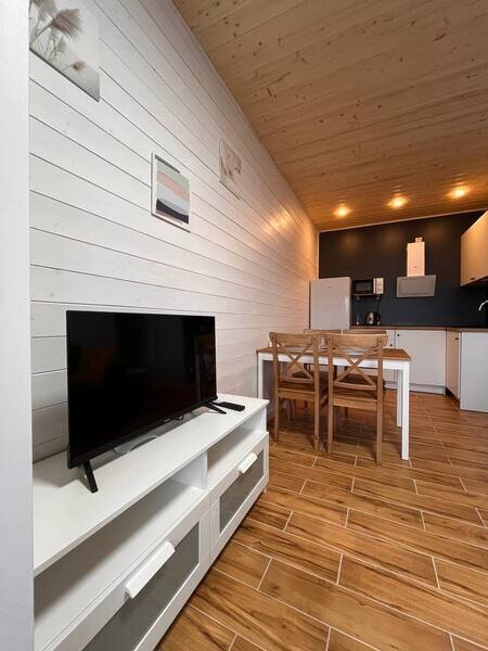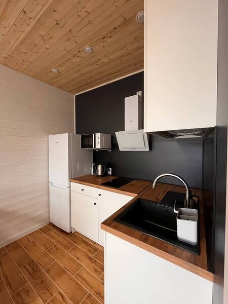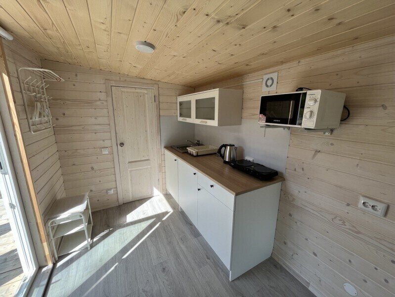 Гостевой дом представляет собой объединенное пространство гостиной и кухни, где находится раскладной двуспальный диван, отдельной спальни с двуспальной кроватью, санузла с душевой.