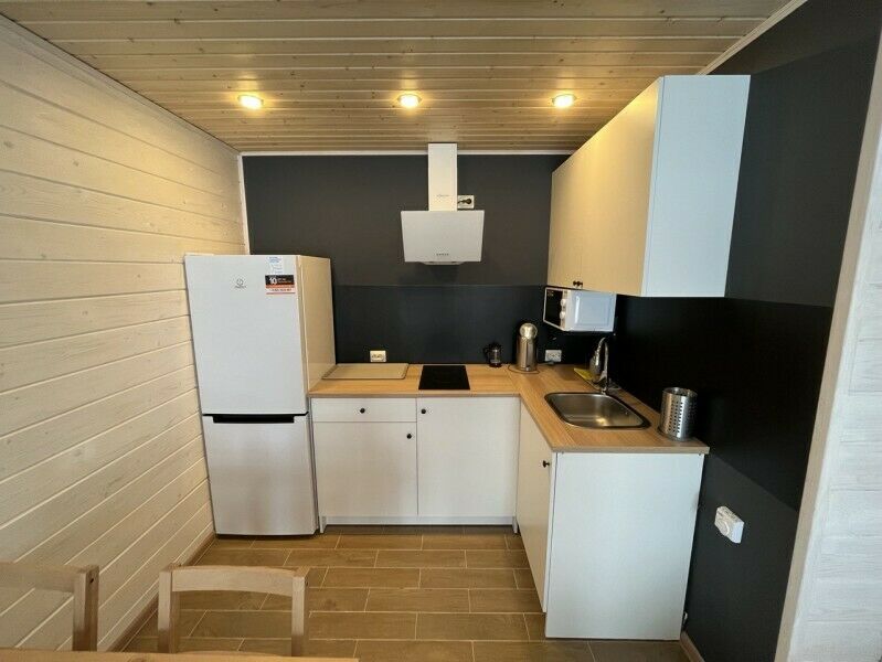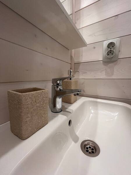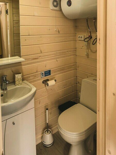 Оборудован всем необходимым для комфортного круглогодичного проживания: тёплые полы, полноценная кухня, санузел с душем и стиральной машиной, скоростной доступ в интернет и телевидение. Есть все необходимое для приготовления пищи и уборки, в т.ч. принадлежности для ВВQ.