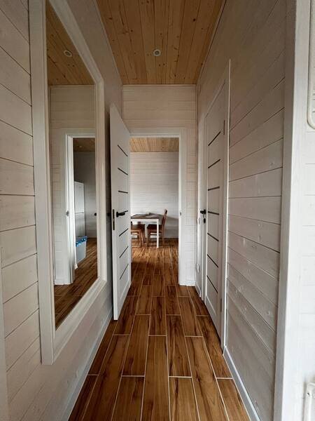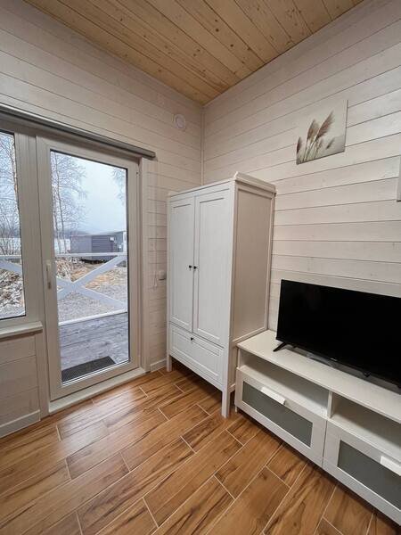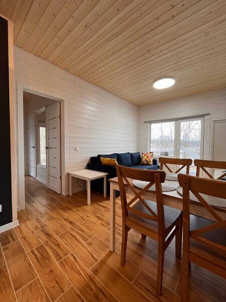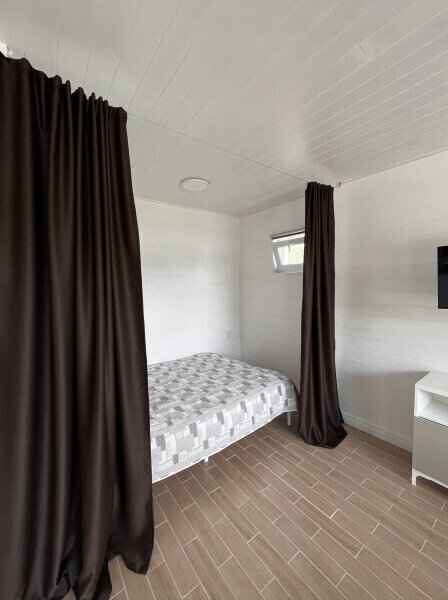 Дом способен принять 4 взрослых, также есть детская кроватка. Дом внутри: гостиная-кухня (раскладной двуспальный диван), отдельная спальня с двуспальной кроватью, санузел, прихожая и терраса.