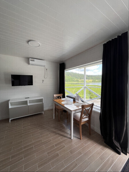 В домике объединённое пространство гостиной и кухни (раскладной двуспальный диван), отдельная спальня с двуспальной кроватью, санузел с душевой и большая веранда с видом на Ладожское озеро.