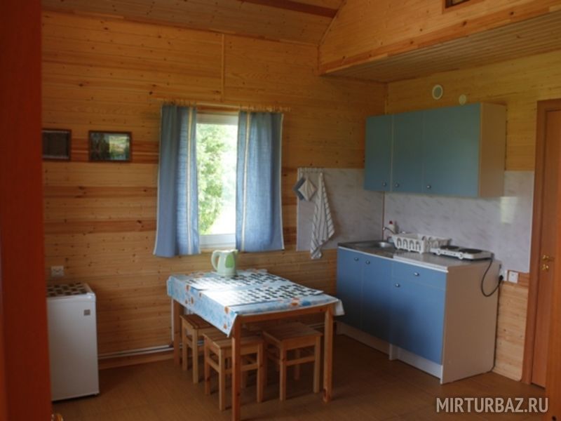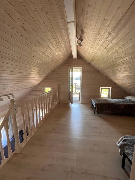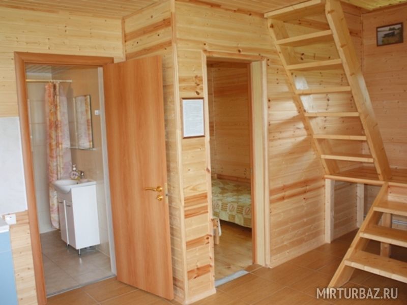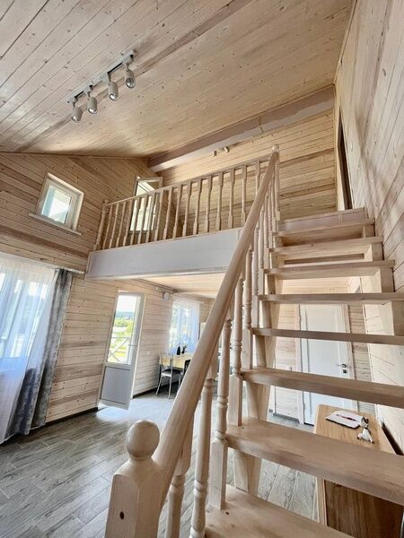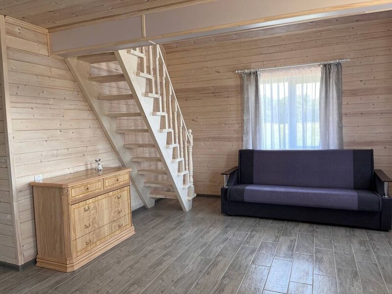 Коттедж разделен на 2 одинаковые части, каждая из которых имеет свой отдельный вход, кухню и душ.