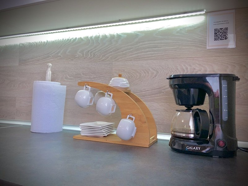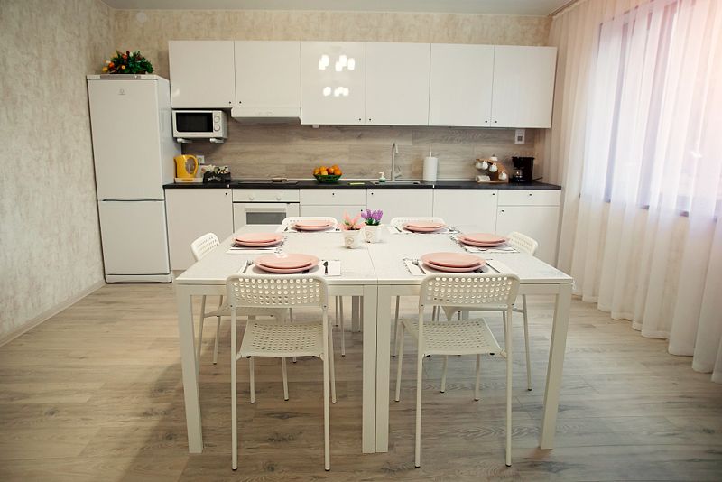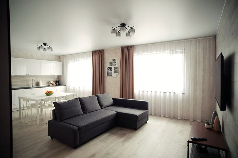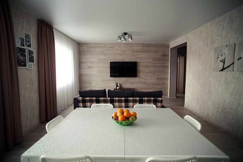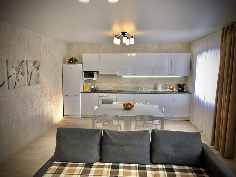 • просторная кухня-гостиная с большим диваном, плазменным телевизором, большим обеденным столом и 100% комплектацией кухонной техники (плита, микроволновка, мультиварка, кофемашина, посудомоечная машина, тостер, чайник);