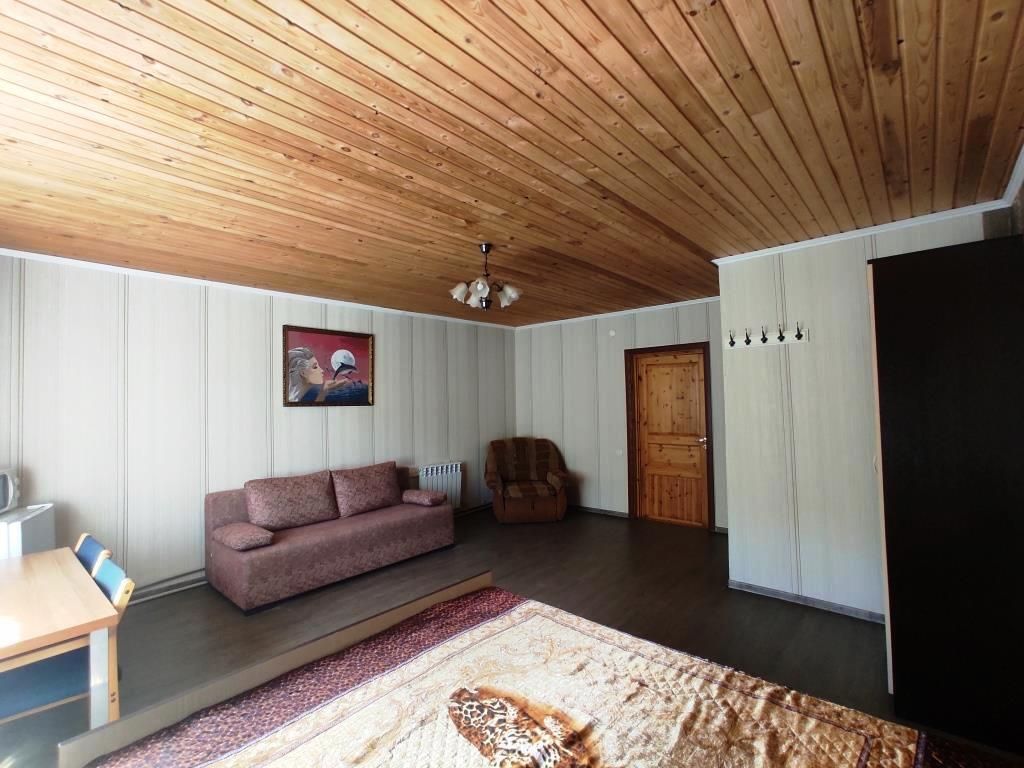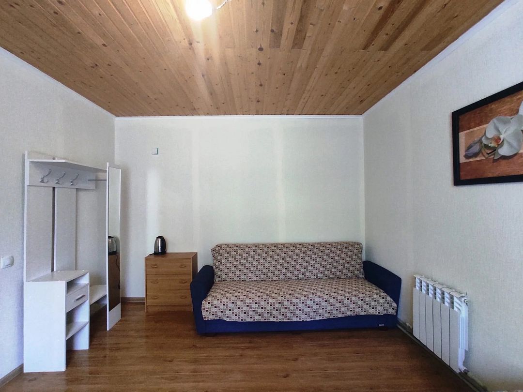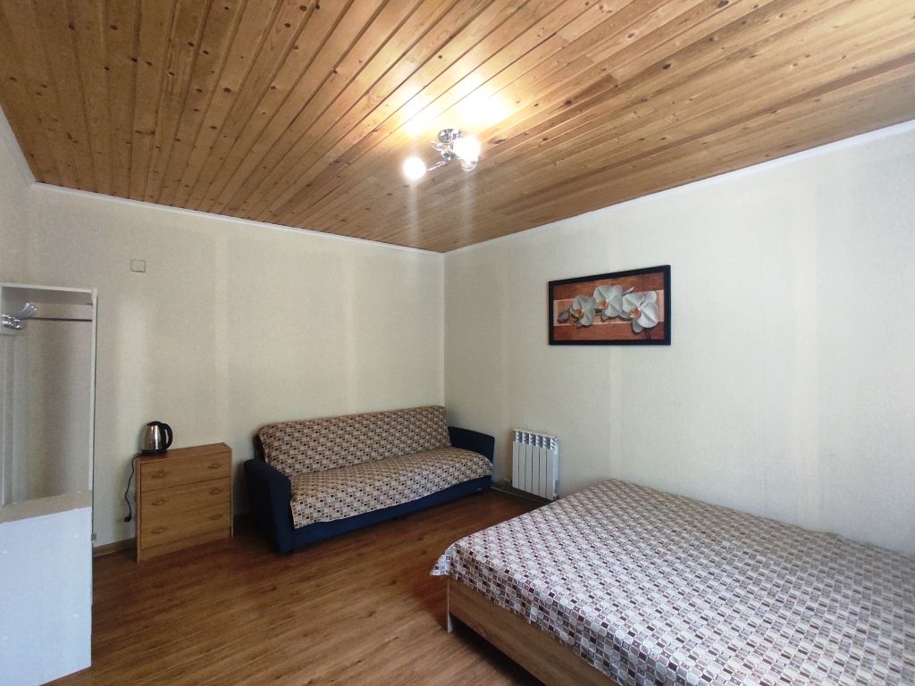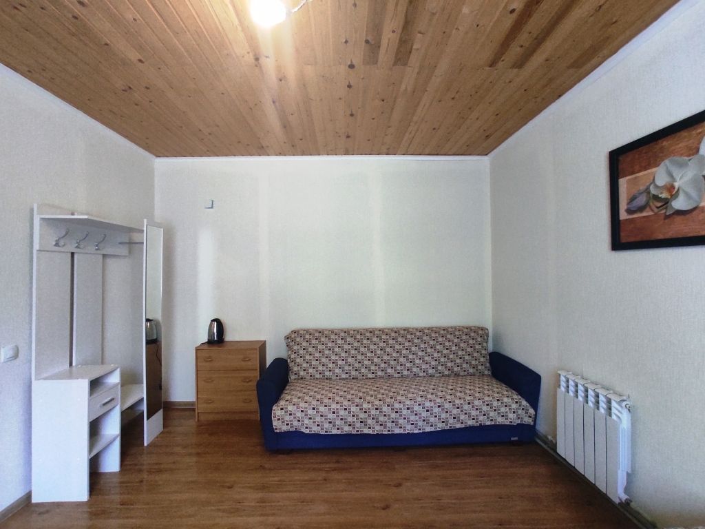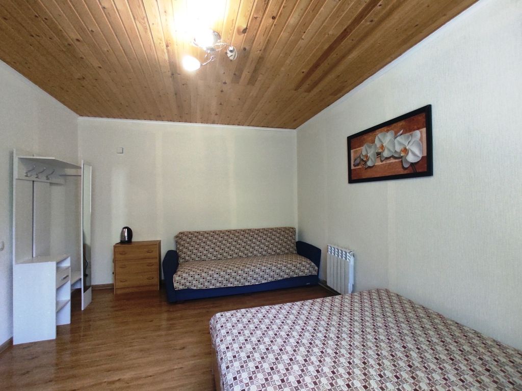 В номере двуспальная кровать, диван, чайник, постельные принадлежности, белье, полотенца для рук, холодильник, санузел. Душ общий на этаже. Размещение до 3 человек. Номер расположен на 2-м этаже. Общая кухня: плита, набор посуды, чайник, холодильник. Беседки и мангалы на территории-бесплатно.