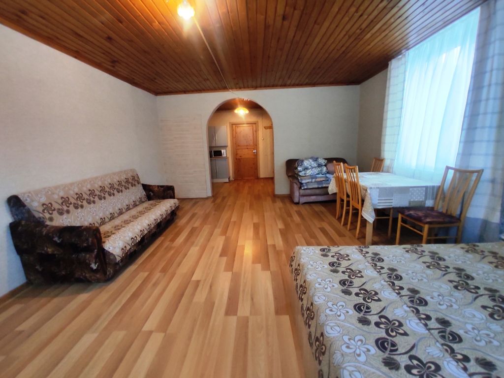 2 смежно-изолированных комнаты: двуспальная кровать, два дивана-кровати, спальные принадлежности, постельное белье, холодильник, микроволновка, чайник, набор посуды (кастрюли, сковородка, тарелки, чашки, столовые приборы и пр), моющие средства, полотенца для рук. Номер расположен на 3-м этаже. Размещение до 6 человек. Беседки и мангалы на территории- бесплатно.