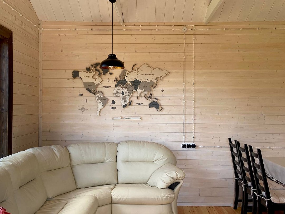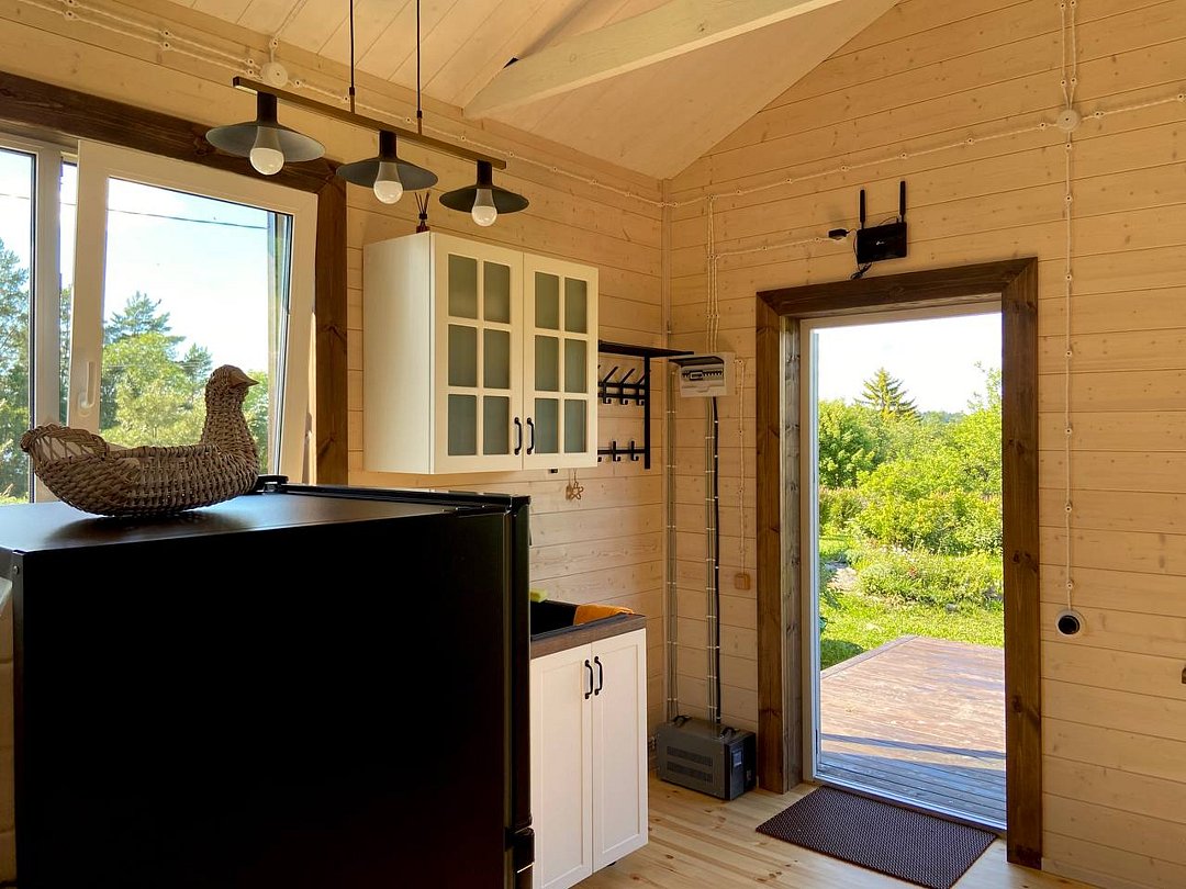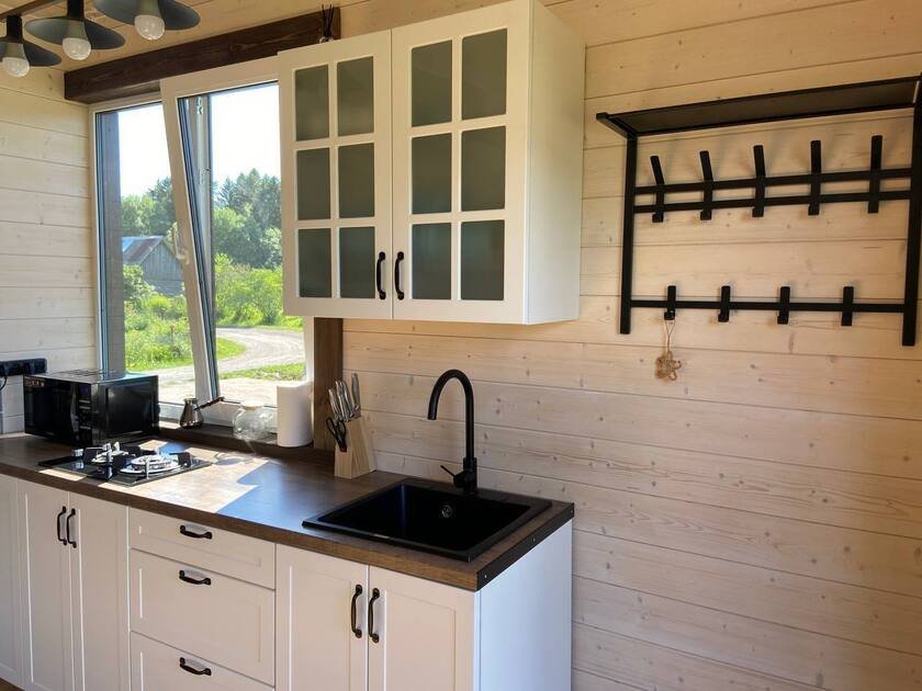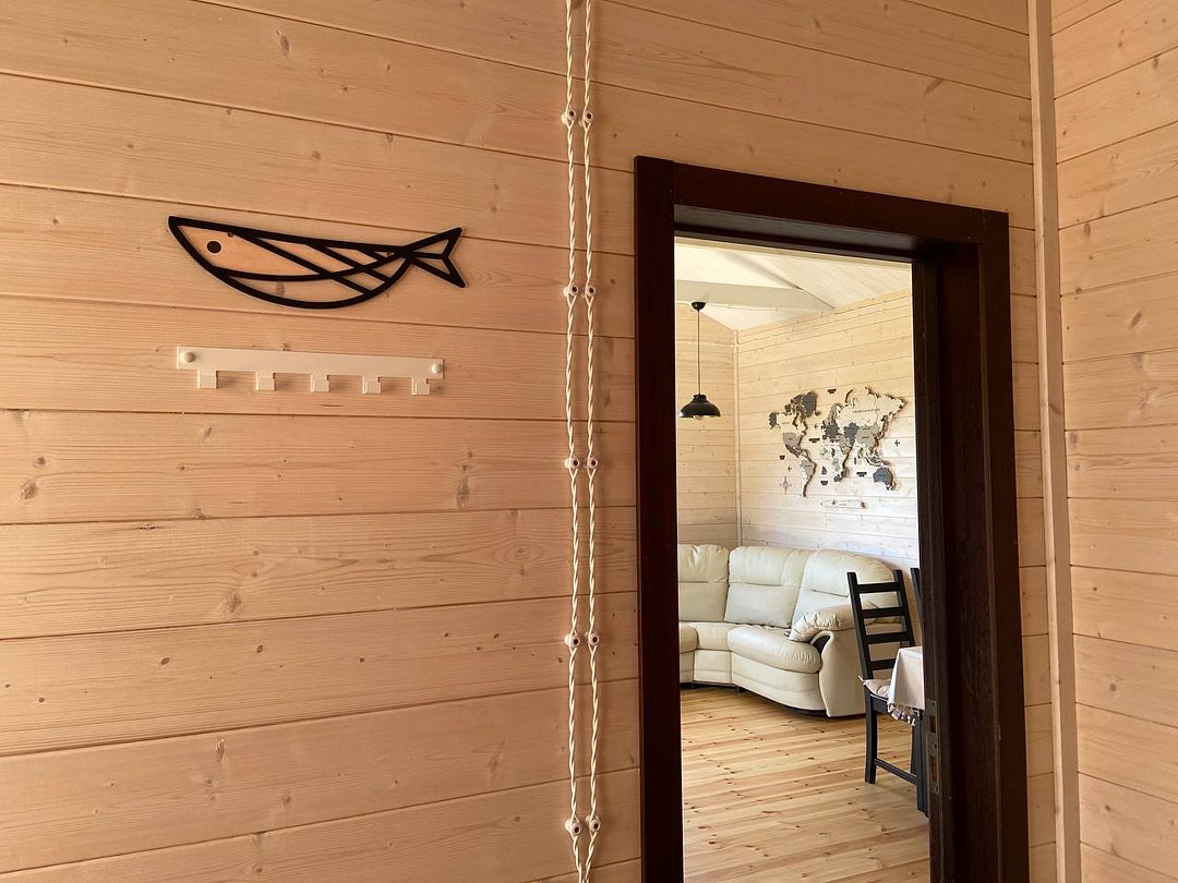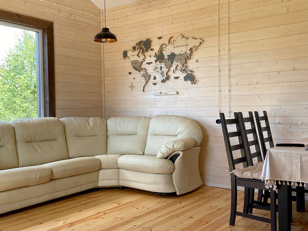 - большой кухни-гостиной с огромным панорамным окном, с видом на озеро и мягким кожаным диваном, который раскладывается и получается спальное место для двоих гостей;