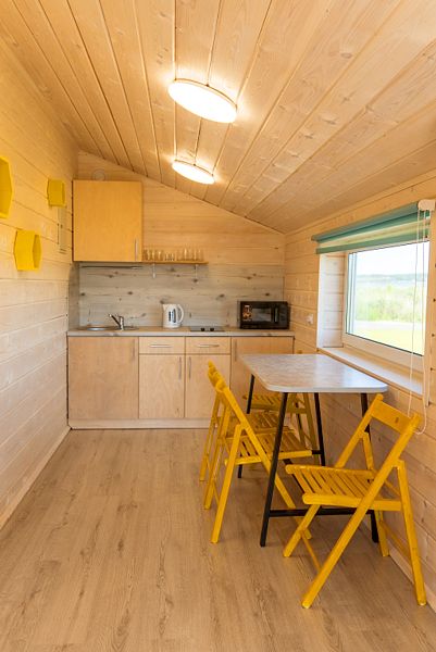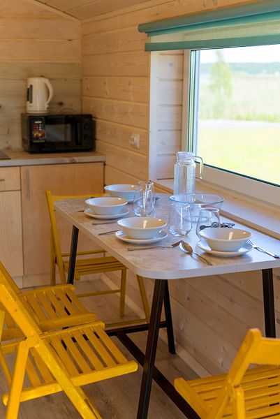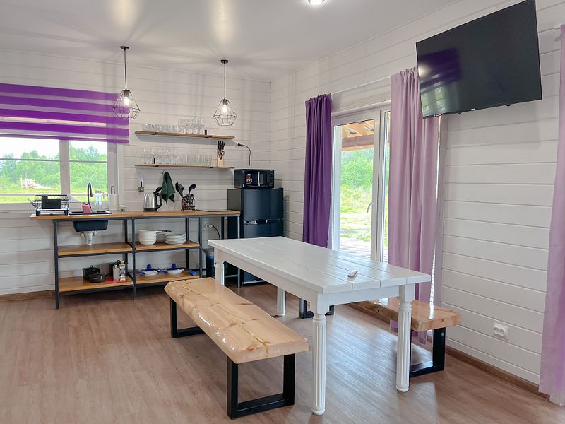 На 1 этаже располагается: гостиная (большой стол с 2 скамьями, 2 кресла-мешка, диван, телевизор), совмещённая с кухней; санузел; баня на дровах и душевая. Кухня полностью оснащена необходимой техникой для приготовления пищи (варочная поверхность, холодильник, микроволновая печь, чайник).