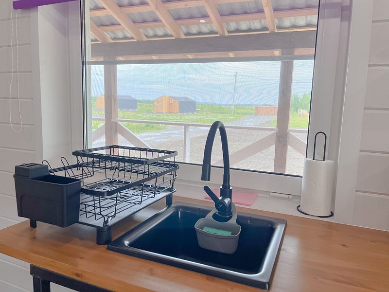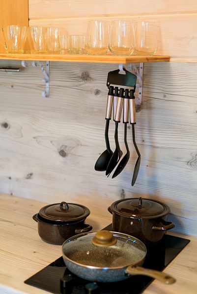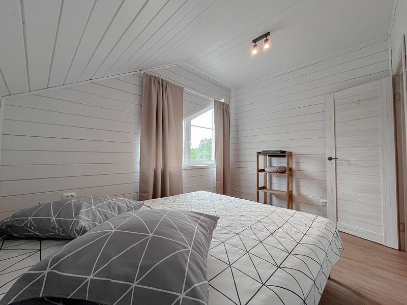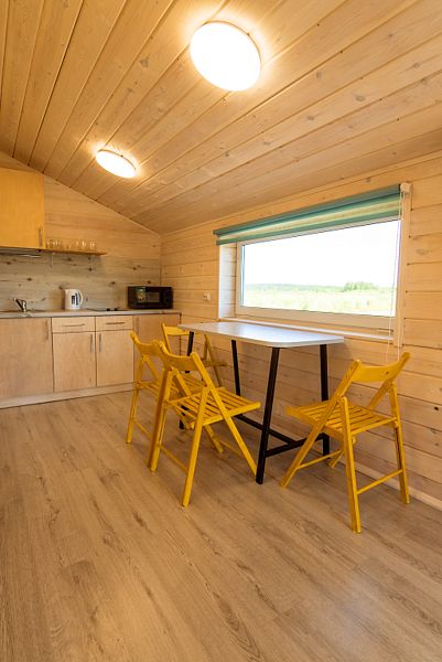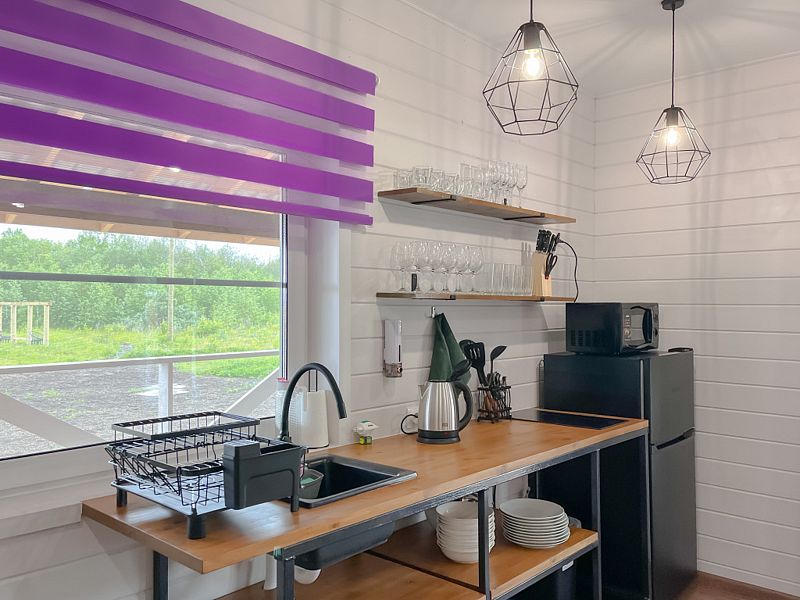 В доме уютная гостиная (с раскладным 2-х спальным диваном) с телевизором, совмещённая с кухней; санузел. Кухня полностью оснащена необходимой техникой для приготовления пищи (варочная поверхность, холодильник, микроволновая печь, чайник). Изолированная спальня с 2-х спальной кроватью.
