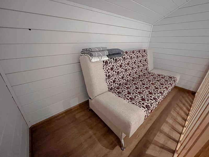 На 1 этаже располагается: большая застеклённая веранда; уютная гостиная, совмещённая с кухней (3-х местный раскладной диван); баня и место для отдыха, совмещённое через перегородку с санузлом.