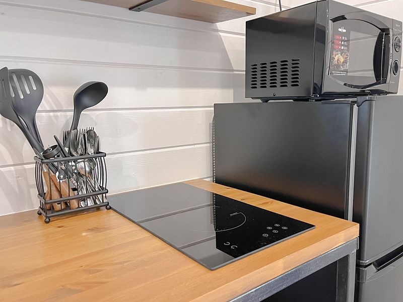 Кухня полностью оснащена необходимой техникой для приготовления пищи (варочная поверхность, холодильник, микроволновая печь, чайник).